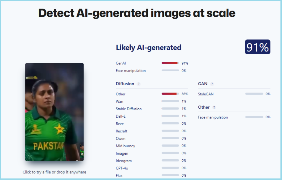 ക്രിക്കറ്റ് ഗ്രൗണ്ടിൽ മാച്ചിനിടെ ഇന്ത്യൻ വനിതാ ക്രിക്കറ്റ് താരം പാക്കിസ്ഥാൻ വനിതാ ക്രിക്കറ്റ് താരത്തിനെ തള്ളി ഇടുന്നത്തിൻ്റെ ദൃശ്യങ്ങൾ എന്ന തരത്തിൽ പ്രചരിപ്പിക്കുന്ന വീഡിയോ എ.ഐ. നിർമ്മിതമാണ്.