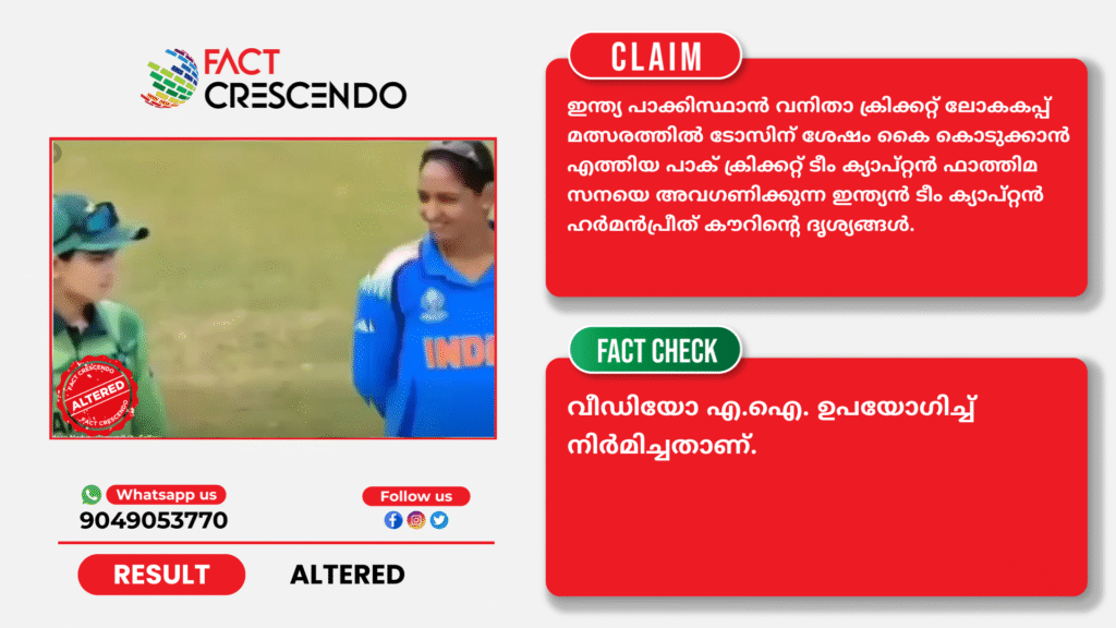 ഇന്ത്യൻ വനിതാ ക്രിക്കറ്റ് ടീം ക്യാപ്റ്റൻ ഹർമൻപ്രീത് കൗർ ലോകകപ്പ് മത്സരത്തിൽ കൈ കൊടുക്കാൻ വന്ന പാക്കിസ്ഥാൻ ക്യാപ്റ്റൻ ഫാത്തിമ സനയെ അവഗണിക്കുന്ന ദൃശ്യങ്ങൾ എ.ഐ. നിർമ്മിതമാണ്.