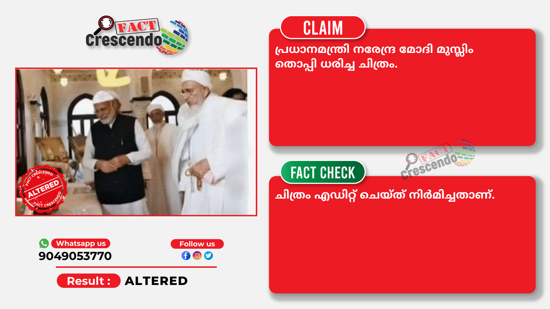 പ്രധാനമന്ത്രി നരേന്ദ്ര മോദി മുസ്ലിം തൊപ്പി ധരിച്ച ചിത്രം എഡിറ്റഡാണെന്ന് അന്വേഷണത്തിൽ നിന്ന് വ്യക്തമാണ്.