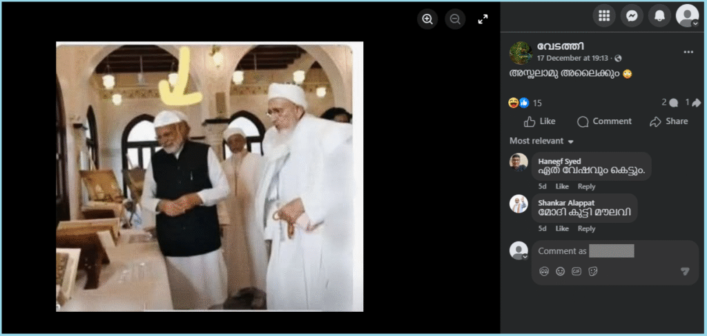 മുകളിൽ നൽകിയ പോസ്റ്റിൽ നമുക്ക് പ്രധാനമന്ത്രി നരേന്ദ്ര മോദി മുസ്ലിം തൊപ്പി ധരിച്ച് നിൽക്കുന്നതായി കാണാം. പോസ്റ്റിൻ്റെ അടികുറിപ്പിൽ പറയുന്നത് ഇങ്ങനെയാണ്: “അസ്സലാമു അലൈക്കും ”