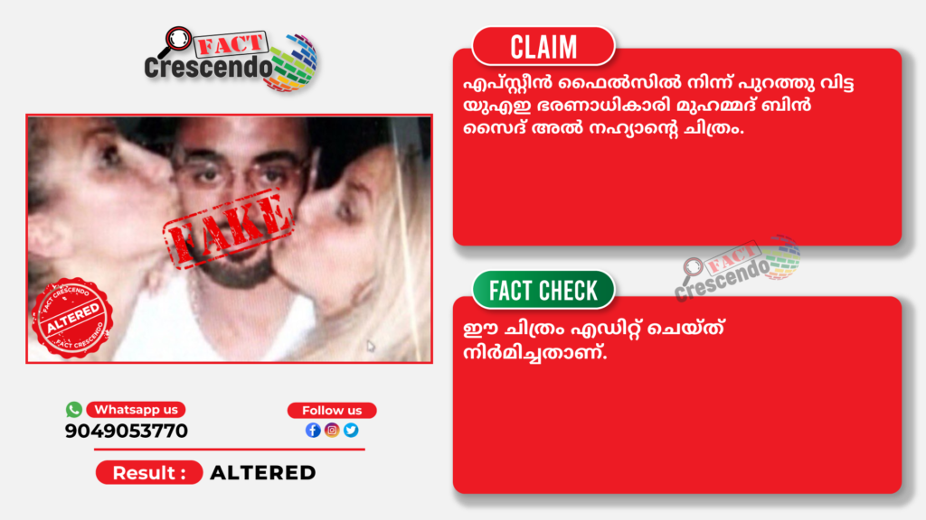 എപ്സ്റ്റീൻ ഫൈൽസിൽ നിന്ന് പുറത്തു വിട്ട യുഎഇ ഭരണാധികാരി മുഹമ്മദ് ബിൻ സൈദ് അൽ നഹ്യാൻ്റെ ചിത്രം എന്ന തരത്തിൽ പ്രചരിപ്പിക്കുന്നത് എഡിറ്റ് ചെയ്ത് നിർമ്മിച്ച ചിത്രമാണ്.