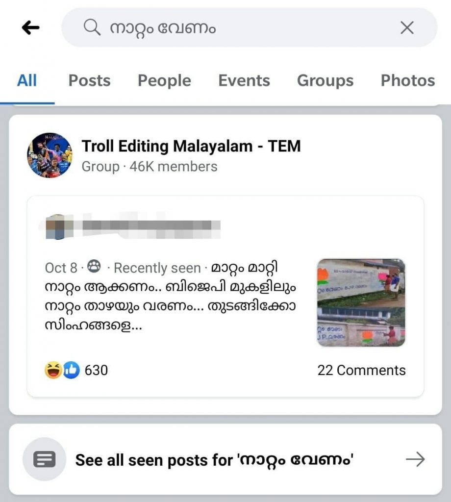 നാറ്റം വേണം എന്ന കീ വേര്ഡ് ഉപയോഗിച്ച് ഫെയ്സ്ബുക്കില് സെര്ച്ച് ചെയ്തപ്പോള് തന്നെ ട്രോള് എഡിറ്റിങ് മലയാളം എന്ന പ്രൈവെറ്റ് ഗ്രൂപ്പിലെ ഒരു പോസ്റ്റാണ് വിഷയവുമായി ബന്ധപ്പെട്ട് കണ്ടെത്താന് കഴിഞ്ഞത്. ട്രോളുകള്ക്ക് ആവശ്യമായ മീമുകളും മറ്റ് എഡിറ്റിങുകളും ഗ്രൂപ്പിലെ അംഗങ്ങള് ആവശ്യപ്പെടുന്നവര്ക്ക് നിര്മ്മിച്ചു നല്കുന്നതി് വേണ്ടിയാണ് ട്രോള് എഡിറ്റിങ് മലയാളം എന്ന ഗ്രൂപ്പ്. ഒക്ടോബര് എട്ടിന് ഗ്രൂപ്പിലെ ഒരു അംഗം ബിജെപിയുടെ ചുവരെഴുതുന്ന ചിത്രം നല്കി മാറ്റം എന്നത് നാറ്റം എന്നാക്കി എഡിറ്റ് ചെയ്തു തരണമെന്ന് ആവശ്യപ്പെട്ടാണ് പോസ്റ്റ് ചെയ്തിരിക്കുന്നത്. ഇതുപ്രകാരം ഗ്രൂപ്പിലെ മറ്റ് അംഗങ്ങള് നിമിഷ നേരങ്ങള്ക്കുള്ളില് മാറ്റം വേണം എന്നതിന് പകരം നാറ്റം വേണമെന്ന് ചുവരെഴുത്തിനോട് സാദൃശ്യമുള്ള തരത്തില് തന്നെ എഡിറ്റ് ചെയ്ത് നല്കിയതായും കമന്റ് ബോക്സില് കാണാം. അതായത് ട്രോളിന് വേണ്ടി എഡിറ്റ് ചെയ്ത ചിത്രം മാത്രമാണിതെന്നതാണ് യാഥാര്ത്ഥ്യം.