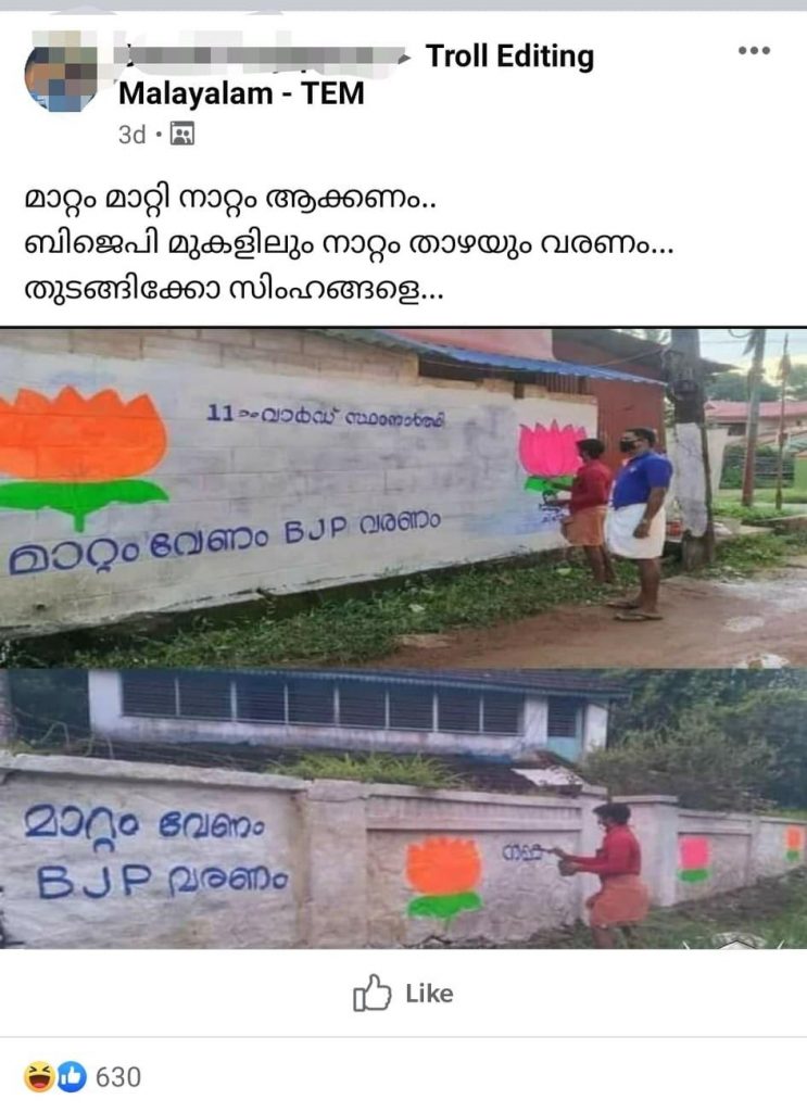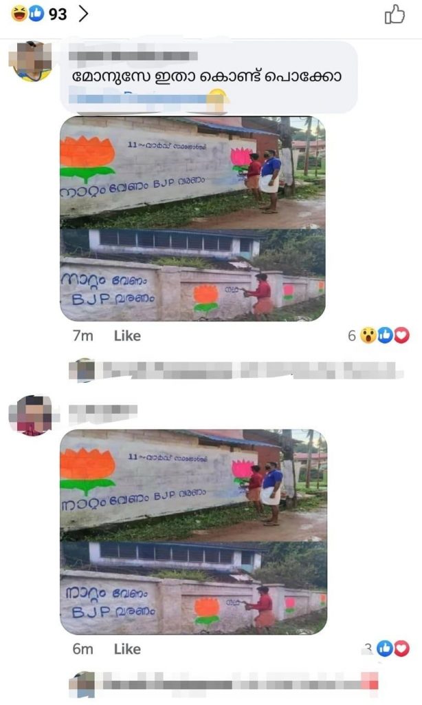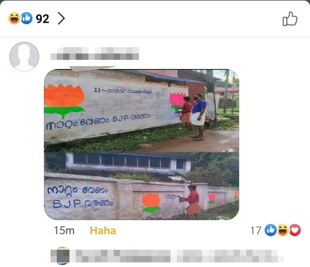 ബിജെപിയുടെ ഒരു തെറഞ്ഞെടുപ്പ് പ്രചരണം ചുവരെഴുത്താണ് ഇപ്പോള് സമൂഹമാധ്യമങ്ങളിലെ ചര്ച്ചാ വിഷയം. പിതിനൊന്നാം വാര്ഡ് സ്ഥാനാര്ത്ഥിയെ വിജയിപ്പിക്കാനായി പ്രചരണത്തിന്റെ ഭാഗമായി മാറ്റം വേണം ബിജെപി വരണം എന്ന എഴുതുന്നതിന് പകരം നാറ്റം വേണം ബിജെപി വരണം എന്നാണ് പ്രചരിക്കുന്ന ചിത്രത്തിലുള്ളത്. എടക്കഴിയൂര് സഖാക്കള് എന്ന പ്രൊഫൈലില് നിന്നും പങ്കുവെച്ചിരിക്കുന്ന ഇതെ പോസ്റ്റിന് 90ല് അധികം ഷെയറുകളും 160ല് അധികം റിയാക്ഷനുളും ലഭിച്ചിട്ടുണ്ട്.