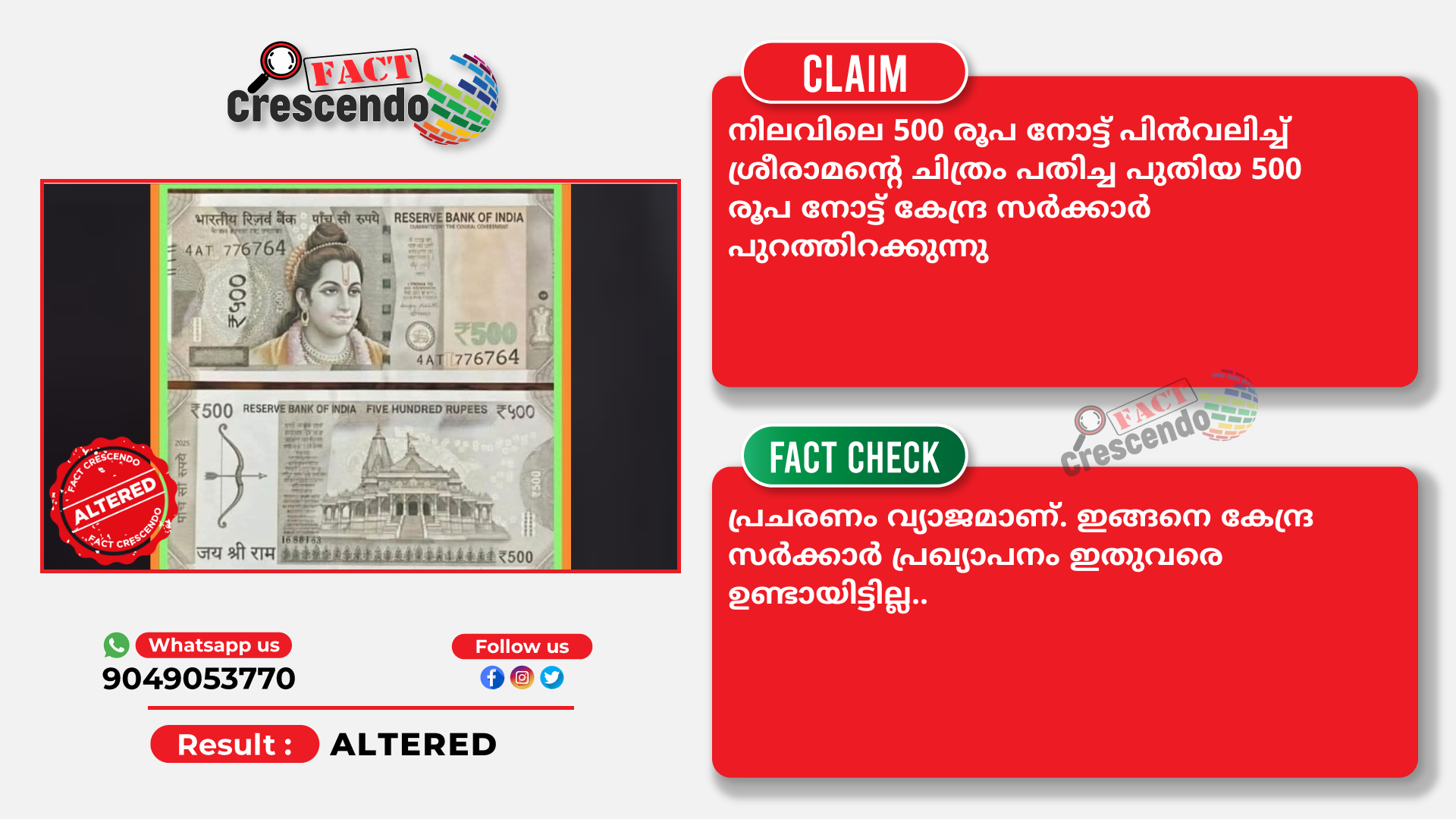 നിലവിലെ 500 രൂപ നോട്ട് പിന്വലിച്ച് ശ്രീരാമന്റെ ചിത്രം പതിച്ച പുതിയ 500 രൂപ നോട്ട് കേന്ദ്ര സര്ക്കാര്പുറത്തിറക്കുന്നുവെന്ന പ്രചരണം വ്യാജമാണ്. ഇങ്ങനെ കേന്ദ്ര സര്ക്കാര് പ്രഖ്യാപനം ഇതുവരെ ഉണ്ടായിട്ടില്ല.