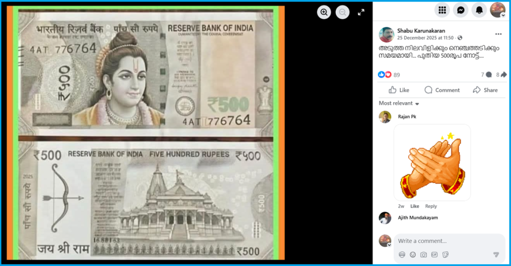 Title:നിലവിലെ 500 രൂപ പിന്വലിച്ച് ശ്രീരാമന്റെ ചിത്രം പതിച്ച പുതിയ നോട്ട്..? പ്രചരണം വ്യാജം…