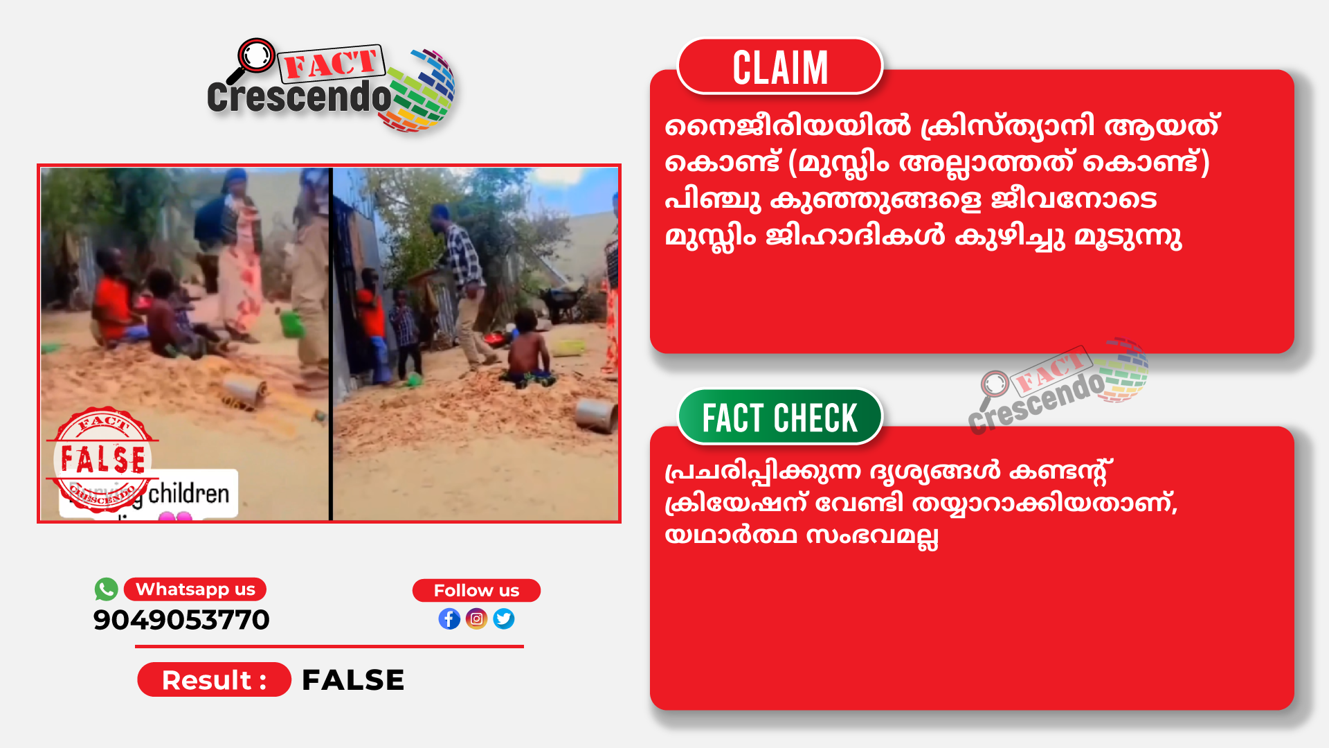 നൈജീരിയയിൽ ക്രിസ്ത്യാനി ആയത് കൊണ്ട് (മുസ്ലിം അല്ലാത്തത് കൊണ്ട്) പിഞ്ചു കുഞ്ഞുങ്ങളെ ജീവനോടെ മുസ്ലിം ജിഹാദികൾ കുഴിച്ചു മൂടുന്നു എന്ന് പ്രചരിപ്പിക്കുന്ന ദൃശ്യങ്ങള് കണ്ടന്റ് ക്രിയേഷന് വേണ്ടി തയ്യാറാക്കിയതാണ്, യഥാര്ത്ഥ സംഭവമല്ല.