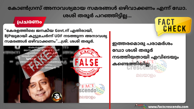 ജനകീയമായ കേരള സര്ക്കാരിനെതിരെ അനാവശ്യമായ സമരങ്ങള് യു.ഡി.എഫ്. ഒഴിവാക്കണം എന്ന തരത്തില് ഒരു പരാമര്ശം ഡോ. ശശി തരൂര് എവിടെയും നടത്തിയതായി കണ്ടെത്തിയില്ല. അതിനാല് പോസ്റ്റില് വാദിക്കുന്നത് വ്യാജമാന്നെന്ന് അനുമാനിക്കാം.