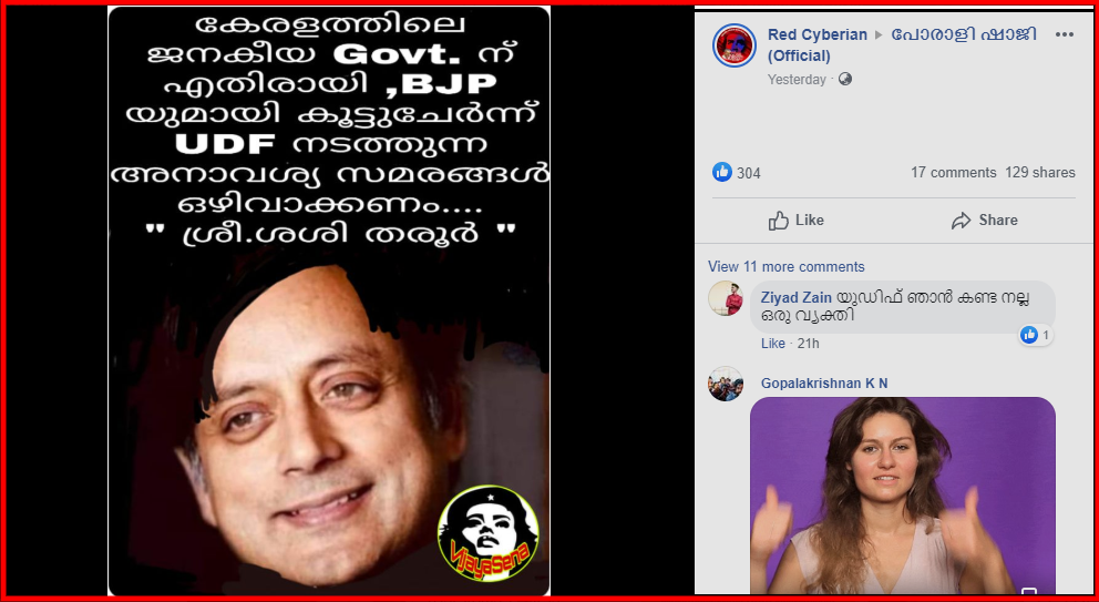 സ്വര്ണകള്ളകടത്ത് കേസിനെ തുടര്ന്നും മന്ത്രി കെ.ടി. ജലീലിന്റെ രാജി ആവശ്യപെട്ടും പ്രതിപക്ഷം സംസ്ഥാന വ്യാപകമായി ശക്തമായ പ്രതിഷേധം നടത്തുകയാണ്. പ്രതിഷേധം നടത്തുന്ന കോണ്ഗ്രസ്, മുസ്ലിം ലീഗ്, ബി.ജെ.പി. പോലെയുള്ള പാര്ട്ടിയുടെ പ്രതിഷേധകര്ക്കെതിരെയായ പോലീസ് നടപടികളും സാമുഹ്യ മാധ്യമങ്ങളിലും മുഖ്യധാര മാധ്യമങ്ങളിലും ചര്ച്ച വിഷയമായിരുന്നു. കോവിഡ്-19 സംസ്ഥാനത്ത് വ്യാപകമായി പ്രചരിക്കുന്ന ഒരു സാഹചര്യത്തിലാണ് ഈ വലിയ പ്രതിഷേധങ്ങള് പ്രതിപക്ഷം സംഘടിപ്പിക്കുന്നത് അതോടെ രോഗ വ്യാപനത്തില് വന് വര്ധനയുണ്ടാകും എന്ന് ഭരണകൂടം ആരോപിക്കുന്നുണ്ട്. ഇതിന്റെ പശ്ചാത്തലത്തില് കോണ്ഗ്രസ് പാര്ട്ടിയുടെ മുതിര്ന്ന നേതാവും മുന് കേന്ദ്ര മന്ത്രിയും നിലവിലെ തിരുവനന്തപുരം എം.പിയുമായി ഡോ. ശശി തരൂര് കോണ്ഗ്രസിനും ഐക്യ ജനാധിപത്യ മുന്നണിക്കുമെതിരെ രംഗതെത്തി എന്ന തരത്തില് പ്രചരണം സാമുഹ്യ മാധ്യമങ്ങളില് വ്യാപകമായി നടക്കുന്നുണ്ട്. ബി.ജെ.പിയുടെ കൂടെ ചേര്ന്ന് ജനകീയമായ കേരള സര്ക്കാരിനെതിരെ സമരം നടത്തുന്ന യു.ഡി.എഫ് തെറ്റാണ് ചെയ്യുന്നത് എന്ന് ഡോ. ശശി തരൂര് ആരോപിക്കുന്നു എന്നാണ് വാദം. പക്ഷെ ഞങ്ങള് ഇതിനെ കുറിച്ച് അന്വേഷിച്ചപ്പോള് ഇത്തരത്തിലൊരു പ്രസ്താവന ഡോ. തരൂര് എവിടെങ്കിലും നടത്തിയതായി കണ്ടെത്തിയില്ല. പ്രചാരണത്തിനെ കുറിച്ച് വിശദാംശങ്ങള് ഇങ്ങനെയാണ്…