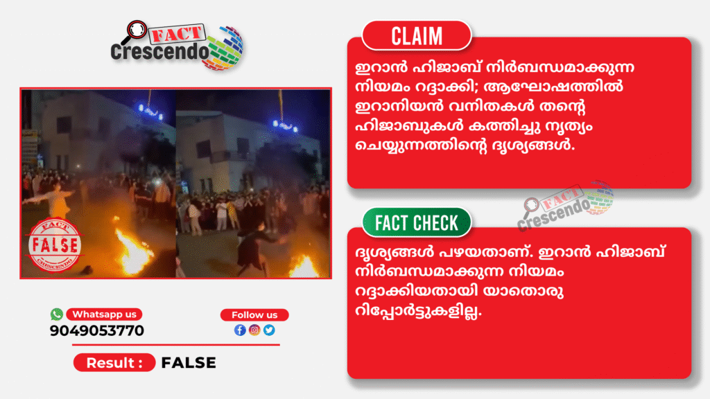 ഇറാൻ ഹിജാബ് നിർബന്ധമാക്കുന്ന നിയമം റദ്ദാക്കി; ആഘോഷത്തിൽ ഇറാനിയൻ വനിതകൾ തൻ്റെ ഹിജാബുകൾ കത്തിച്ചു നൃത്തം ചെയ്യുന്നത്തിൻ്റെ ദൃശ്യങ്ങൾ എന്ന തരത്തിൽ ഒരു വീഡിയോ സമൂഹ മാധ്യമങ്ങളിൽ പ്രചരിപ്പിക്കുന്നുണ്ട്.