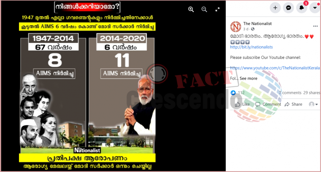 2014 മുതല് 2020ന്റെ ഇടയില് കേന്ദ്ര സര്ക്കാര് രാജ്യത്തില് 11 AIIMS നിര്മിച്ചു എന്ന തരത്തില് സാമുഹ മാധ്യമങ്ങളില് പ്രചരണം നടക്കുന്നുണ്ട്.