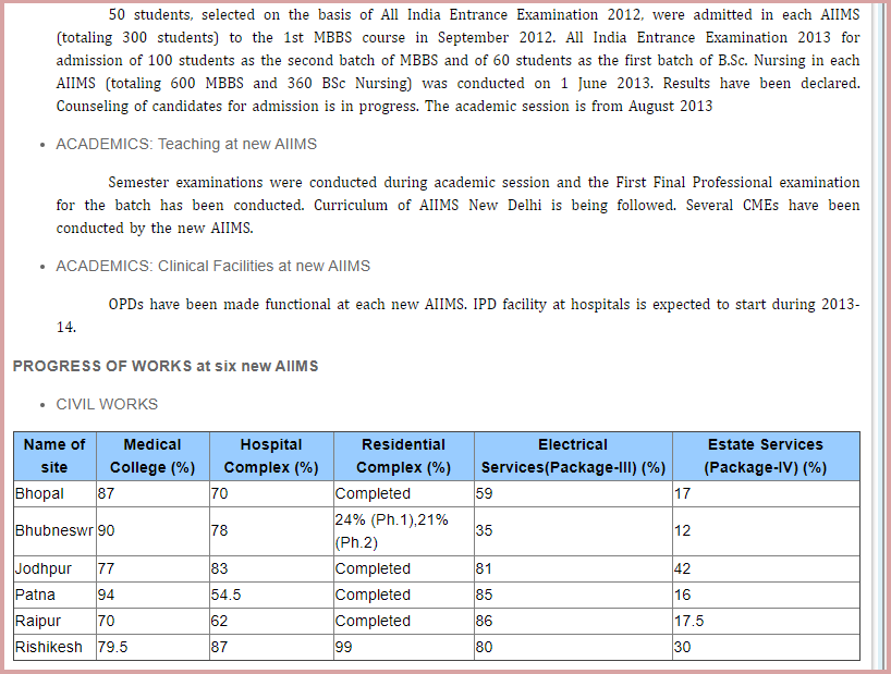 ഈ പറയുന്ന AIIMS ആശുപത്രികളില് നിലവില് പ്രവര്ത്തിക്കുന്ന 6 ആശുപത്രികളുടെ പണി തുടങ്ങിയത് UPA സര്ക്കാറിന്റെ കാലത്താണ്. 12 ഏപ്രില് 2014, അതായത് നരേന്ദ്ര മോദി പ്രധാനമന്ത്രിയായി ചുമതല ഏറ്റെടുക്കുന്നത്തിനെ ഏകദേശം ഒരു മാസം മുമ്പ് വരെയുള്ള ഈ AIIMS ആശുപത്രികളുടെ നിര്മാണം എത്രത്തോളം കഴിഞ്ഞിരുന്നു എന്ന് നമുക്ക് താഴെ കാണാം.