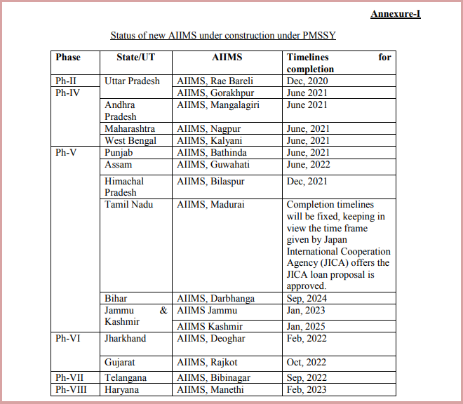 സെപ്റ്റംബര് 18, 2020ന് ലോകസഭയില് ഒരു ചോദ്യത്തിന്റെ മറുപടിയില് കേന്ദ്ര ആരോഗ്യവും കുടുംബക്ഷം സഹമന്ത്രിയായ അശ്വനി കുമാര് ചോബെ രാജ്യത്തില് പല ഇടത്തില് നിര്മിക്കുന്ന AIIMS ആശുപത്രികളെ കുറിച്ച് വിശദമായി മറുപടി നല്കി. അദ്ദേഹത്തിന്റെ മറുപടി പ്രകാരം PMSSY പദ്ധതി പ്രകാരം പ്രഖ്യപ്പിച്ച 22AIIMS ആശുപത്രികളില് നിന്ന് മുഴുവനായി പ്രവര്ത്തിക്കുന്നത് 6 എണ്ണമാണ്. ബാക്കിയുള്ള ആശുപത്രികളുടെ നിലവിലെ സ്ഥിതി ഇപ്രകാരമാണ്: