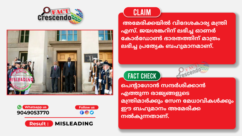 സമുഹ മാധ്യമങ്ങളില് വിദേശകാര്യ മന്ത്രിക്ക് അമേരിക്കയില് ലഭിച്ച ഓണര് കോര്ഡോണ് ഭാരതത്തിന് മാത്രം ലഭിച്ച ബഹുമാനം ആണ് എന്ന പ്രചരണം തെറ്റാണെന്ന് അന്വേഷണത്തില് നിന്ന് വ്യക്തമാകുന്നു.