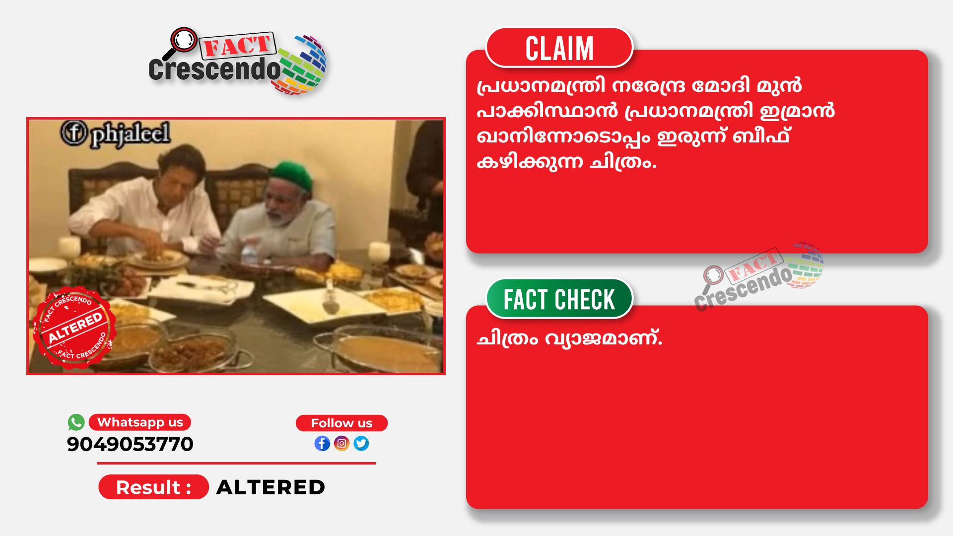 പ്രധാനമന്ത്രി നരേന്ദ്ര മോദി മുൻ പാക്കിസ്ഥാൻ പ്രധാനമന്ത്രി ഇമ്രാൻ ഖാനോടൊപ്പം ഇരുന്ന് ബീഫ് കഴിക്കുന്ന ചിത്രം എന്ന തരത്തിൽ ഒരു ചിത്രം സമൂഹ മാധ്യമങ്ങളിൽ പ്രചരിപ്പിക്കുന്നുണ്ട്.