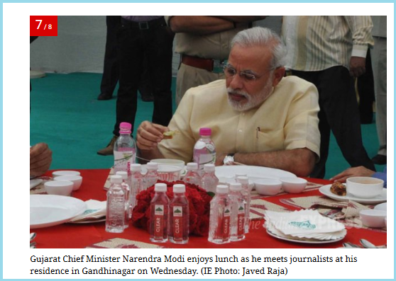 പ്രധാനമന്ത്രി നരേന്ദ്ര മോദി നവംബർ 2013ൽ ഗുജറാത്ത് മുഖ്യമന്ത്രിയായിരിക്കുമ്പോൾ അദ്ദേഹത്തിൻ്റെ ഔദ്യോഗിക വസതിയിൽ മാധ്യമ പ്രവർത്തകർക്കായി ഒരു പരിപാടി സംഘടിപ്പിച്ചിരുന്നു. ഈ പരിപാടിയിൽ അദ്ദേഹം ഭക്ഷണം കഴിക്കുന്ന ഫോട്ടോ ഇന്ത്യൻ എക്സ്പ്രസ്സ് പ്രസിദ്ധികരിച്ചിരുന്നു. ഈ ചിത്രം നമുക്ക് താഴെ കാണാം.