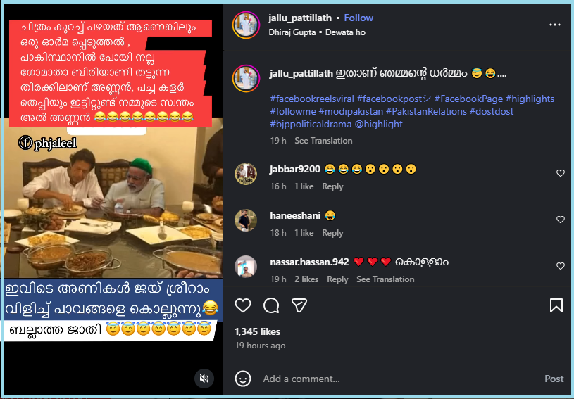 മുകളിൽ നൽകിയ പോസ്റ്റിൽ നമുക്ക് ഒരു ചിത്രം കാണാം. ചിത്രത്തിൽ പ്രധാനമന്ത്രി നരേന്ദ്ര മോദി മുൻ പാക്കിസ്ഥാൻ പ്രധാനമന്ത്രി ഇമ്രാൻ ഖാനിനോടൊപ്പം ഇരുന്ന് അത്താഴം കഴിക്കുന്നതായി കാണാം. ചിത്രത്തിൻ്റെ മുകളിൽ എഴുതിയ വാചകം എപ്രകാരമാണ്: “ചിത്രം കുറച്ച് പഴയതാണെങ്കിലും ഒരു ഓർമപ്പെടുത്തൽ, പാകിസ്ഥാനിൽ പോയി നല്ല ഗോമാതാ ബിരിയാണി തട്ടുന്ന തിരക്കിലാണ് അണ്ണൻ, പച്ച കളർ തൊപ്പിയും ഇട്ടിട്ടുണ്ട് നമ്മുടെ സ്വന്തം അൽ അണ്ണൻ…ഇവിടെ അണികൾ ജയ് ശ്രീ റാം വിളിച്ച് പാവങ്ങളെ കൊള്ളുന്നു… ” പോസ്റ്റിൻ്റെ അടിക്കുറിപ്പിൽ പറയുന്നത് ഇപ്രകാരമാണ്:
