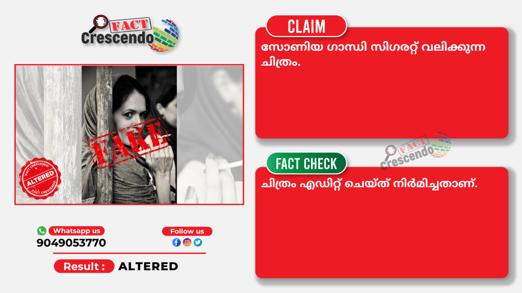 സമൂഹ മാധ്യമങ്ങളില് സോണിയ ഗാന്ധിയുടെ സിഗരറ്റ് വലിക്കുന്ന ചിത്രം എന്ന തരത്തില് പ്രചരിപ്പിക്കുന്ന ചിത്രം എഡിറ്റ് ചെയ്ത് നിര്മിച്ചതാണെന്ന് അന്വേഷണത്തില് നിന്ന് വ്യക്തമാകുന്നു.