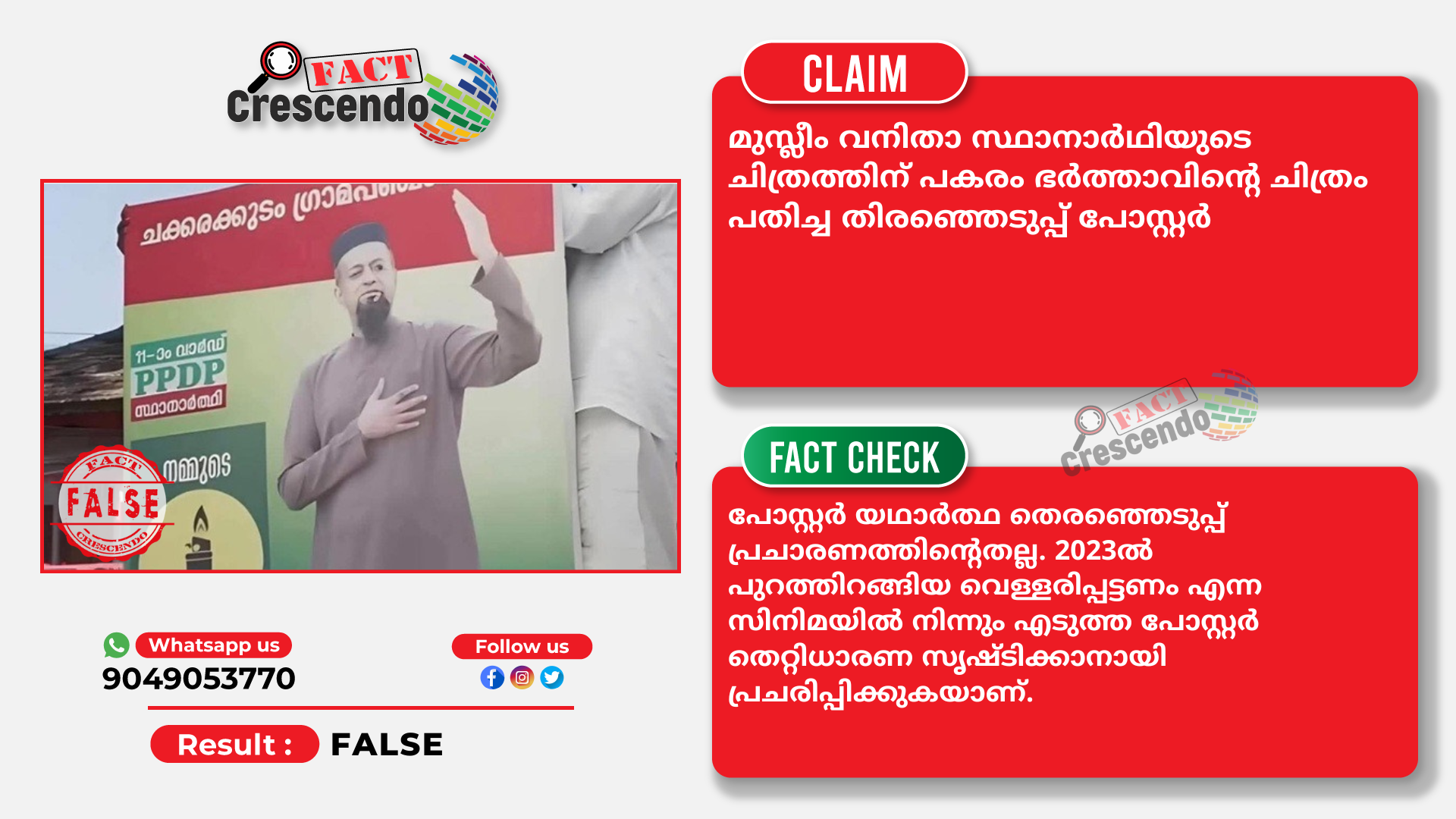 മുസ്ലീം വനിതാ സ്ഥാനാര്ഥിയുടെ ചിത്രത്തിന് പകരം ഭര്ത്താവിന്റെ ചിത്രം പതിച്ച തിരഞ്ഞെടുപ്പ് പോസ്റ്റര് യഥാര്ത്ഥ തെരഞ്ഞെടുപ്പ് പ്രചാരണത്തിന്റെതല്ല. 2023ല് പുറത്തിറങ്ങിയ വെള്ളരിപ്പട്ടണം എന്ന സിനിമയില് നിന്നും എടുത്ത പോസ്റ്റര് തെറ്റിധാരണ സൃഷ്ടിക്കാനായി പ്രചരിപ്പിക്കുകയാണ്.