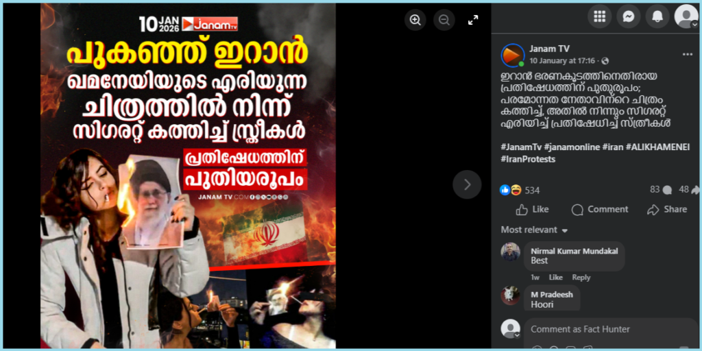 മുകളിൽ നൽകിയ പോസ്റ്റിൽ നമുക്ക് ഇറാനിൻ്റെ പരമോന്നത നേതാവ് അലി ഖമേനിയുടെ ചിത്രം ഒരു സ്ത്രീ സിഗരെറ്റ് വെച്ച് കത്തിക്കുന്നതായി കാണാം. പോസ്റ്റിൻ്റെ അടികുറിപ്പിൽ പറയുന്നത് ഇങ്ങനെയാണ്: “ഇറാൻ ഭരണകൂടത്തിനെതിരായ പ്രതിഷേധത്തിന് പുതുരൂപം; പരമോന്നത നേതാവിന്റെ ചിത്രം കത്തിച്ച്, അതിൽ നിന്നും സിഗരറ്റ് എരിയിച്ച് പ്രതിഷേധിച്ച് സ്ത്രീകൾ”