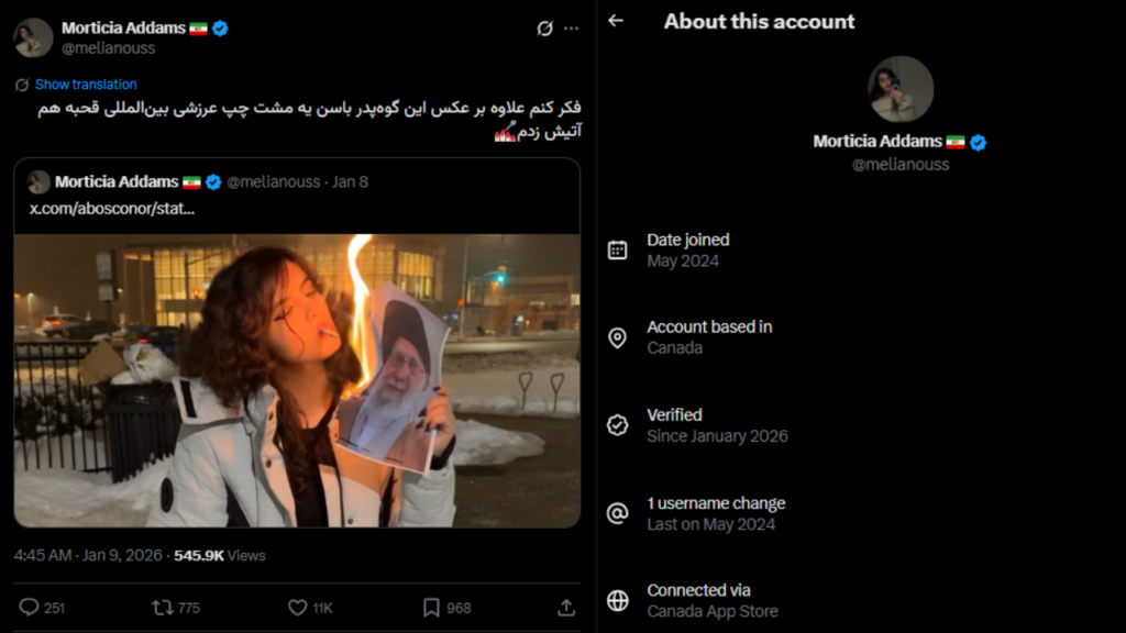ഈ യുവതിയുടെ X പ്രൊഫൈൽ പരിശോധിച്ചപ്പോൾ ഈ യുവതി കാനഡയിൽ ഒരു ഇറാനി അഭയാർത്ഥിയാണെന്ന് വ്യക്തമാകുന്നു.
