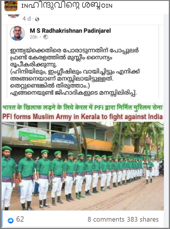 ഇക്കഴിഞ്ഞ ദിവസം മുതൽ സാമൂഹ്യ മാധ്യമങ്ങളിൽ ഇതിൽ പ്രചരിക്കുന്ന ഒരു ചിത്രമാണ് ഇവിടെ നൽകിയിട്ടുള്ളത്. പച്ച നിറത്തിലെ ഷർട്ടും വൈറ്റ് നിറത്തിലെ പാന്റും ധരിച്ച കുറെ യുവാക്കൾ പരേഡ് നടത്താന് എന്നപോലെ അച്ചടക്കത്തോടെ നിരയായി നിൽക്കുന്ന ചിത്രത്തിനൊപ്പം ഹിന്ദിയിലും ഇംഗ്ലീഷിലും വിവരണമുണ്ട്: ഇന്ത്യക്കെതിരെ പോരാടുന്നതിന് പോപ്പുലർഫ്രണ്ട് കേരളത്തിൽ മുസ്ലിം സൈന്യം രൂപീകരിക്കുന്നു ഇംഗ്ലീഷിലും ഹിന്ദിയിലും വായിച്ചിട്ട് എനിക്ക് ഇങ്ങനെയാണ് മനസ്സിലാക്കുന്നത് തെറ്റുണ്ടെങ്കിൽ തിരുത്താം ഇത് എങ്ങനെയുണ്ട് ജിഹാദികളുടെ മനസ്സിലിരിപ്പ്. എന്ന അടിക്കുറിപ്പും കാണാം.