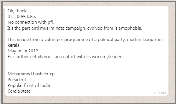 കൂടാതെ ഞങ്ങള് പോപ്പുലര് ഫ്രണ്ട് കേരള അദ്ധ്യക്ഷന് മുഹമ്മദ് ബഷീറുമായി സംസാരിച്ചു. അദ്ദേഹം ഞങ്ങളെ അറിയിച്ചത് ഇങ്ങനെയാണ്: ഇത് തെറ്റായ പ്രചരണമാണ്. ട്വിറ്ററില് പ്രചരിക്കുന്നതായി ശ്രദ്ധയില് പെട്ടു. സംഘടനയെ അപകീര്ത്തിപ്പെടുത്താനുള്ള ശ്രമത്തിന്റെ ഭാഗമാണ് ഇതെല്ലാം. മാത്രമല്ല, പോപ്പുലര് ഫ്രണ്ടിന്റെ യൂണിഫോം ഇതല്ല. നീല ഷര്ട്ടും ചാര നിറത്തിലുള്ള പാന്റുമാണ് ഞങ്ങളുടെ വോളണ്ടിയര് യൂണിഫോം. ചിത്രം മുസ്ലിം ലീഗിന്റെ ഏതോ വോളണ്ടിയര് പ്രോഗ്രാമിന്റെതാണ്.”