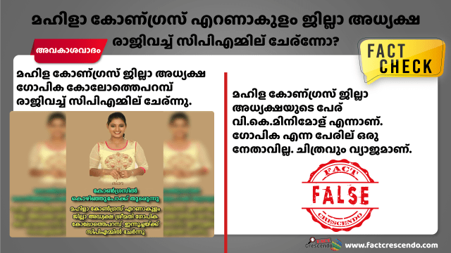 Title:മഹിളാ കോണ്ഗ്രസ് എറണാകുളം ജില്ലാ അധ്യക്ഷ രാജിവച്ച് സിപിഎമ്മില് ചേര്ന്നോ?