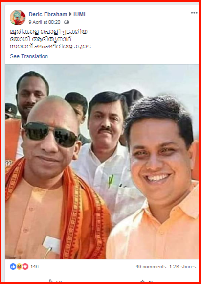 ഉത്തര് പ്രദേശ് മുഖ്യമന്ത്രി യോഗി ആദിത്യനാഥും തലശേരി എംഎല്എയായ എ.എന്.ഷംസീറും ഒരുമിച്ചുള്ള സെല്ഫിയാണ് ഫെയ്സ്ബുക്കില് ഏറെ ചര്ച്ച ചെയ്യപ്പെടുന്ന ഒരു പോസ്റ്റ്. ഐയുഎംഎല് (ഇന്ത്യന് യൂണിയന് മുസ്ലിം ലീഗ്) എന്ന ഗ്രൂപ്പില് ഡെറിക് എബ്രഹാം എന്ന പ്രൊഫൈലില് നിന്നും ഏപ്രില് ഒന്പതിനാണ് ഇത്തരം ഒരു ചിത്രം അപ്ലോഡ് ചെയ്തിരിക്കുന്നത്. ചിത്രത്തിന് നല്കിയിരിക്കുന്ന തലക്കെട്ട് ഇപ്രകാരമാണ്.