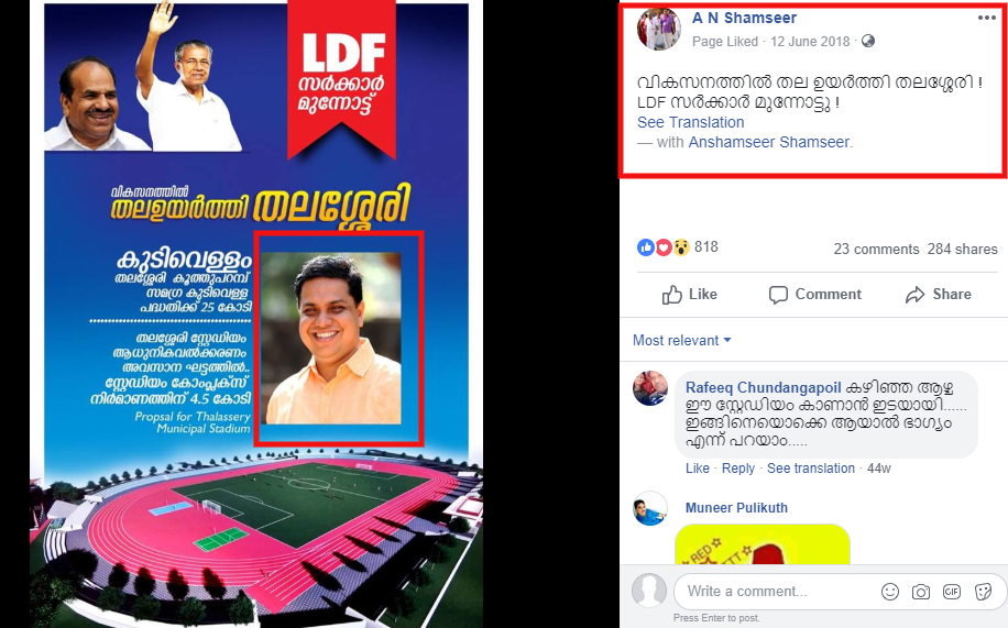 എ.എന്.ഷംസീര് എംഎല്എയുടെ ഫെയ്സ്ബുക്ക് പേജ് പരിശോധിച്ചപ്പോള് 2018 ഏപ്രില് 14നു വിഷു ആശംസകള് അര്പ്പിച്ച് പോസ്റ്റ് ചെയ്തിരിക്കുന്ന അതെ ചിത്രമാണ് യോഗിയോടൊപ്പമുള്ള സെല്ഫിയായി മാറ്റിയിരിക്കുന്നതെന്ന് കണ്ടെത്താന് കഴിഞ്ഞു. ഷംസീര് മാത്രമുള്ള ഇതെ ചിത്രത്തില് നിന്നും ക്രൊപ്പ് ചെയ്ത് എഡിറ്റ് ചെയ്ത് യോഗിയുടെ ചിത്രത്തില് എഡിറ്റ് ചെയ്ത് ചേര്ത്തിരിക്കുകയാണ് പ്രചരിപ്പിക്കുന്ന പോസ്റ്റിലുള്ള ചിത്രം. 2018 ജൂണ് 12നും ഷംസീറിന്റെ ഇതെ ചിത്രം ഉപയോഗിച്ച് വികസന നേട്ടങ്ങള് എന്ന പേരില് ഒരു പോസ്റ്റര് ഇറക്കിയിരുന്നു. അതും അദ്ദേഹത്തിന്റെ ഔദ്യോഗിക പേജില് കാണാന് സാധിക്കും.
