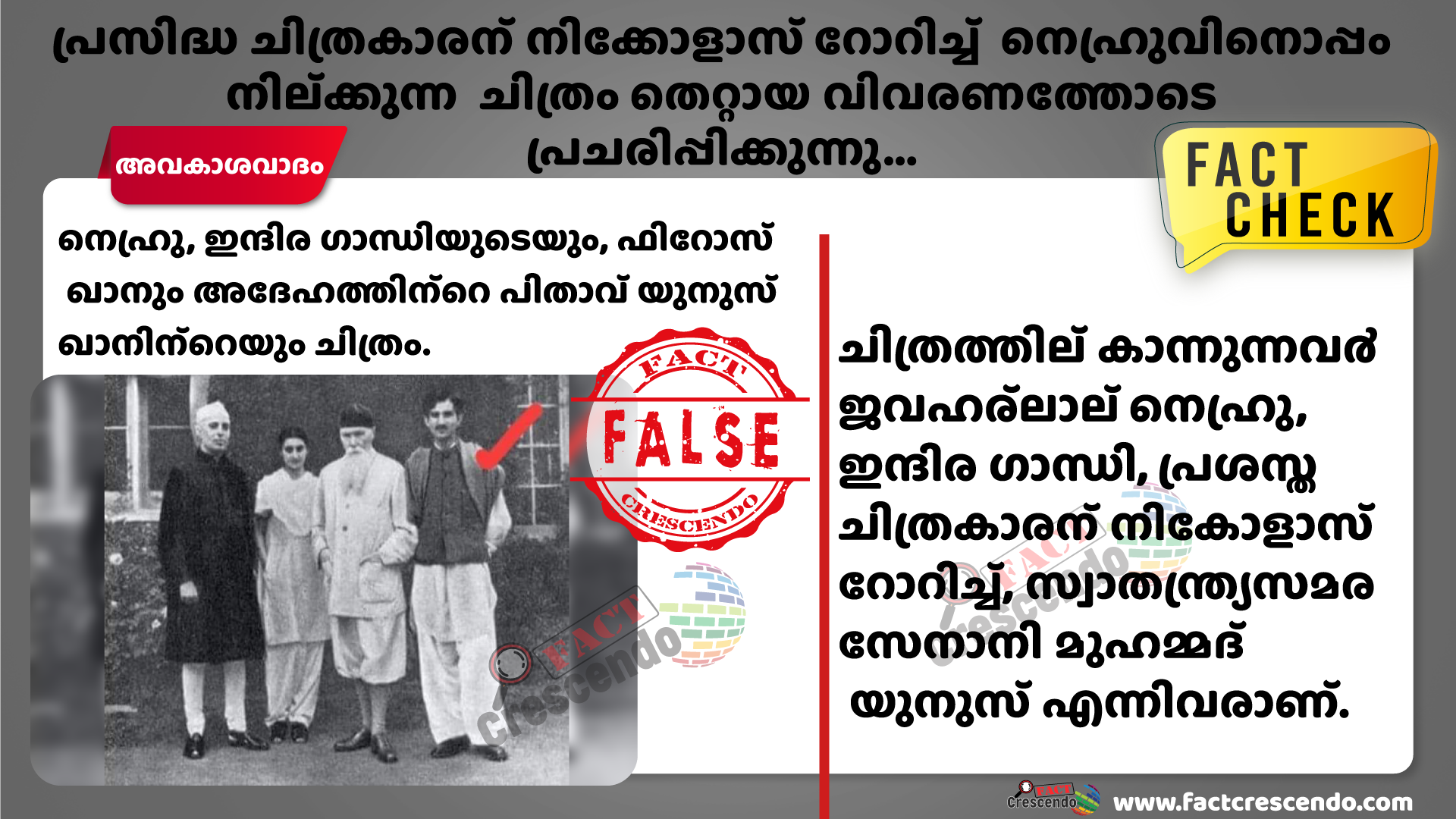 ചിത്രത്തില് നെഹ്രുവും, ഇന്ദിര ഗാന്ധിയോടൊപ്പം നില്കുന്നത് പോസ്റ്റില് വാദിക്കുന്ന പോലെ യുനുസ് ഖാനും, ഫിറോസ് ഖാനും ഒന്നുമല്ല പകരം പ്രശസ്ത ചിത്രകാരന് നികോളാസ് റോറിച്ചും മുന് കോണ്ഗ്രസ് നേതാവ് മുഹമ്മദ് യുനുസുമാണ്.
