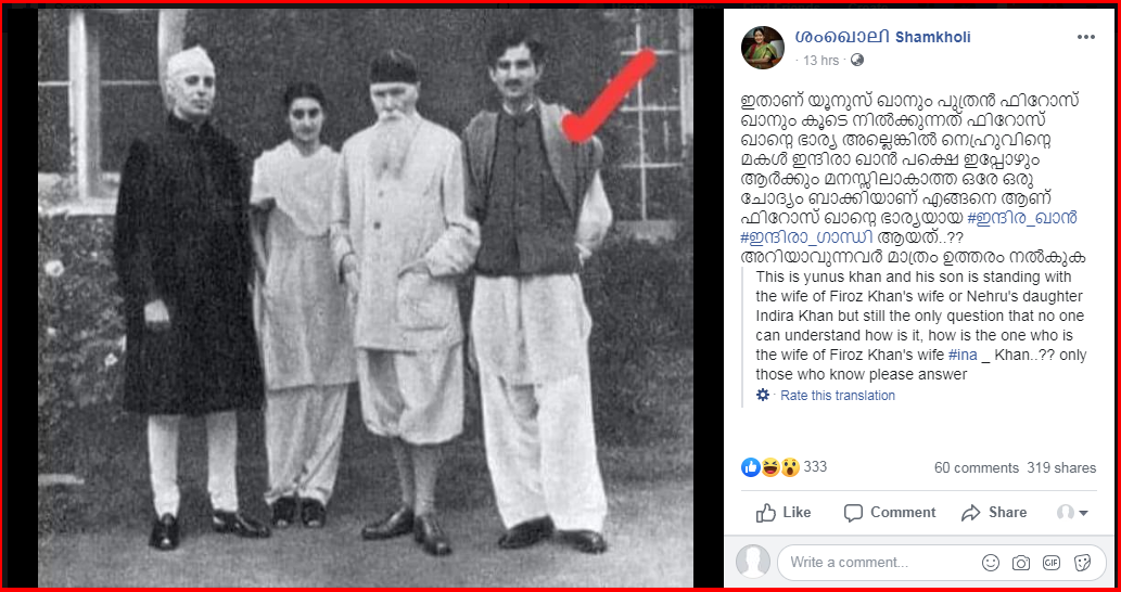“ഇതാണ് യൂനുസ് ഖാനും പുത്രൻ ഫിറോസ് ഖാനും കൂടെ നിൽക്കുന്നത് ഫിറോസ് ഖാന്റെ ഭാര്യ അല്ലെങ്കിൽ നെഹ്രുവിന്റെ മകൾ ഇന്ദിരാ ഖാൻ പക്ഷെ ഇപ്പോഴും ആർക്കും മനസ്സിലാകാത്ത ഒരേ ഒരു ചോദ്യം ബാക്കിയാണ് എങ്ങനെ ആണ് ഫിറോസ് ഖാന്റെ ഭാര്യയായ #ഇന്ദിര_ഖാൻ #ഇന്ദിരാ_ഗാന്ധി ആയത്..?? അറിയാവുന്നവർ മാത്രം ഉത്തരം നൽകുക”