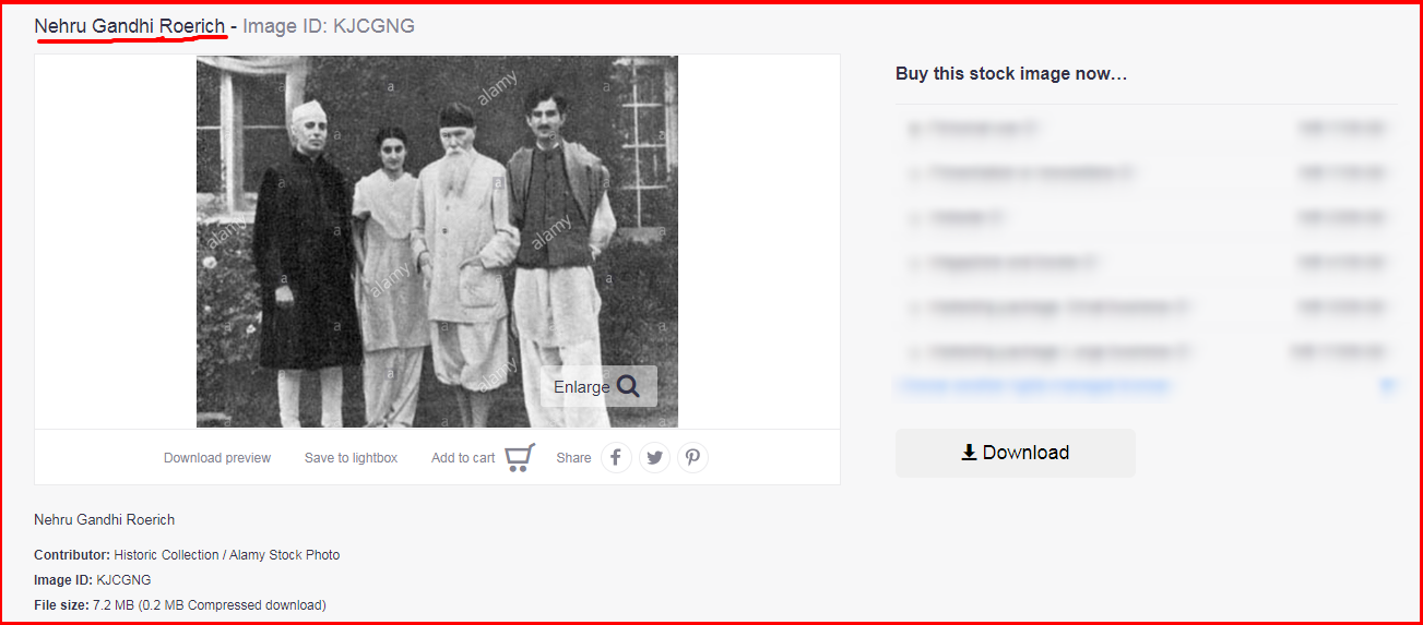 ചിത്രത്തിന്റെ അടികുറിപ്പ് ഇപ്രകാരമാണ്: നെഹ്രു ഗാന്ധി റോറിച്ച്. ഞങ്ങള് ഈ വിവരം വെച്ച് ഗൂഗിളില് അന്വേഷിച്ചപ്പോള് ഞങ്ങള്ക്ക് artcorusse.org എന്ന വെബ്സൈറ്റിലും ഇതേ ചിത്രം ലഭിച്ചു. വെബ്സൈറ്റില് നല്കിയ അടികുറിപ്പ് പ്രകാരം ചിത്രത്തില് നെഹ്രുവും, ഇന്ദിര ഗാന്ധിയോടൊപ്പം പ്രസിദ്ധ ചിത്രകാരന് നികൊലാസ് റോറിച്ചാണ്.