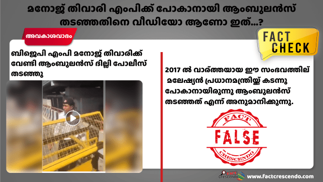ഈ പോസ്റ്റിൽ നൽകിയിരിക്കുന്ന വീഡിയോ മനോജ് തിവാരി എംപി യ്ക്കായി ആംബുലൻസിനെ തടഞ്ഞു നിർത്തിയിരിക്കുന്നതിന്റെതല്ല. 2017 ൽ മലേഷ്യൻ പ്രധാനമന്ത്രിയ്ക്ക് പോകാനായി തടഞ്ഞതു വച്ചതാണ് എന്ന് അനുമാനിക്കുന്നു..