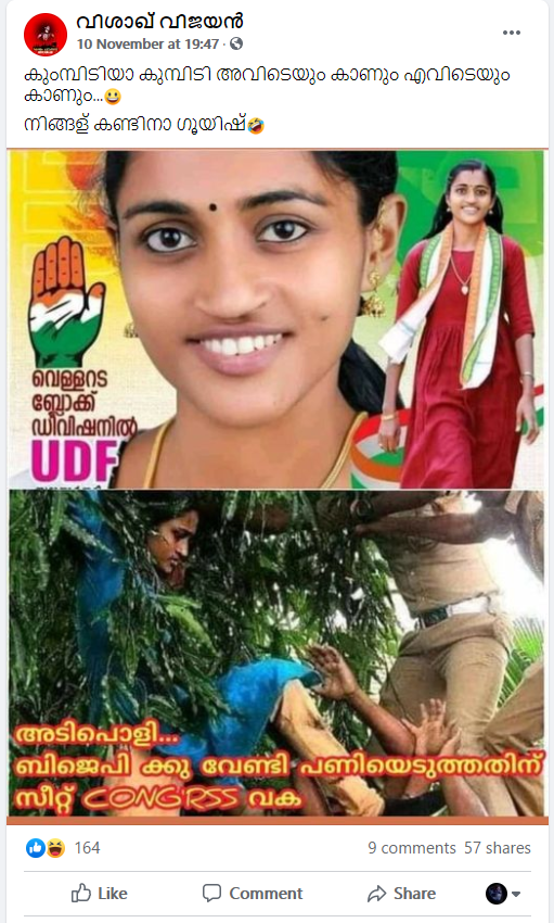 അടിപൊളി ബിജെപിക്ക് വേണ്ടി പണിയെടുത്തതിന് സീറ്റ് കോണ്ഗ്രസ് വക.. എന്ന തലക്കെട്ട് നല്കി ഒരു പെണ്കുട്ടിയുടെ രണ്ട് ചിത്രങ്ങള് ചേര്ത്തുള്ള പോസ്റ്റ് കഴിഞ്ഞ കുറച്ച് ദിവസങ്ങളായി സാമൂഹ്യമാധ്യമങ്ങളില് പ്രചരിക്കുന്നുണ്ട്. തദ്ദേശ തെരഞ്ഞെടുപ്പില് വെള്ളറിട ബ്ലോക്ക് ഡിവഷനിലെ സ്ഥാനാര്ത്ഥിയായ ആനി പ്രസാദ് ജെ.പിയുടെ ചിത്രം ഉപയോഗിച്ചാണ് സമൂഹമാധ്യമങ്ങളില് പ്രചരണം നടക്കുന്നത്. ആനി പ്രസാദ് കുറച്ച് നാളുകള്ക്ക് മുന്പ് ബിജെപിയുടെ സമരത്തില് പങ്കെടുക്കുകയും പോലീസുകാരുമായി അടിപിടിയുണ്ടാക്കുന്ന ചിത്രവും സമൂഹമാധ്യമങ്ങളില് പ്രചരിച്ചിരുന്നു എന്നതാണ് അവകാശവാദം. വിശാഖ് വിജയന് എന്ന വ്യക്തിയുടെ പ്രൊഫൈലില് നിന്നും ഇത്തരത്തില് പങ്കുവെച്ചിരിക്കുന്ന ചിത്രത്തിന് ഇതുവരെ 164ല് അധികം റിയാക്ഷനുകളും 57ല് അധികം ഷെയറുകളും ലഭിച്ചിട്ടുണ്ട്.