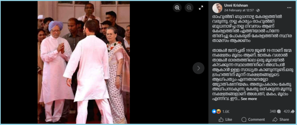 മുകളിൽ നമുക്ക് ഒരു ചിത്രം കാണാം. വീഡിയോയിൽ നമുക്ക് രാഹുൽ ഗാന്ധിയുടെ മുന്നിൽ മുൻ പ്രധാനമന്ത്രി ഡോ. മൻമോഹൻ സിംഗ് കൈകൂപ്പി നിൽക്കുന്നതായി കാണാം. രാഹുൽ ഗാന്ധിയും സോണിയ ഗാന്ധിയും ഡോ.മൻമോഹൻ സിംഗ് പ്രധാനമന്ത്രിയായിരുന്നപ്പോൾ എങ്ങനെ അപമിച്ചിരുന്നു എന്ന് ആരോപിച്ച് ഈ ചിത്രത്തെ കുറിച്ച് പോസ്റ്റിൻ്റെ അടികുറിപ്പിൽ പറയുന്നത് ഇങ്ങനെയാണ്: “രാഹുൽജി ബുധനാഴ്ച കേരളത്തിൽ വരുന്നു. നല്ല കാര്യം രാഹുൽജി ബുധനാഴ്ച്ച നല്ല ദിവസം ആണ് കേരളത്തിൽ എത്തിയാൽ പിന്നേ തിരിച്ചു പോകരുത് കേരളത്തിൽ സ്ഥിര താമസം ആക്കണം താങ്കൾ ജനിച്ചത് 1970 ജൂൺ 19 നാണ് ജന്മ നക്ഷത്രം മൂലം ആണ്. ജാതക വശാൽ താങ്കൾ ഭാരതത്തിലെ ഒരു മൂലയിൽ കിടക്കുന്ന സ്ഥലത്തിന്റെ അധിപൻ ആകാൻ ഉള്ള സാധ്യത കാണുന്നുണ്ട്.ഒരു ഗ്രഹത്തിന് മൂന്ന് നക്ഷത്രങ്ങളുടെ ആധിപത്യം എന്നതാണല്ലോ ജ്യോതിഷനിയമം. അതുപ്രകാരം കേതു അധിപനാകുന്ന, കേതു ഭരിക്കുന്ന മൂന്നു നക്ഷത്രങ്ങളാണ് അശ്വതി, മകം, മൂലം എന്നിവ. ഈ മൂന്നു നാളുകാരുടെയും ജനനം കേതുദശയിലായിരിക്കും. മറ്റുവാക്കുകളില് പറഞ്ഞാല് ഈ നാളുകാരുടെ ജന്മദശാധിപനാണ് കേതു. ഒന്ന് ആഞ്ഞു പരിശ്രമിച്ചാൽ മൂലം നക്ഷത്ര കാരനായ അങ്ങേയ്ക്ക് കേരളത്തിലെ മുഖ്യമന്ത്രി ആകാനുള്ള സാഹചര്യം കാണുന്നുണ്ട് 😍👍 SDPI ജമാത്തെ ഇസ്ലാമി ലീഗ് പോലുള്ള വർഗീയ വോട്ട് ബാങ്ക് ഉള്ളത് കൊണ്ട് കേരളത്തിൽ നിങ്ങൾക്ക് നല്ല സ്കോപ്പ് ഉണ്ട്. ഇവിടെ തന്നെ കൂടണം അല്ലാതെ പ്രധാനമന്ത്രി ആവുമെന്ന് സ്വപ്നത്തിൽ പൊലും കരുതണ്ട കാരണം കേരളത്തിന് പുറത്തുള്ള ഇന്ത്യയിലെ മഹാ ഭൂരിപക്ഷം ജനങ്ങൾ കപട മുഖമൂടി ഇട്ട കോൺഗ്രസ് എന്ന വർഗീയ പ്രീണന അഴിമതി പാർട്ടിയെ യും വ്യാജ ഗാന്ധി പേരും കൊണ്ടു നടക്കുന്ന നിങളുടെ നെഹ്റു കുടുംബത്തെയും പണ്ടേ തിരിച്ചറിഞ്ഞിട്ടുണ്ട് ഇന്ത്യയെ ഇസ്ലാമിക രാജ്യം ആക്കണമെന്ന് ആഗ്രഹിക്കുന്ന കുറെ ഇസ്ലാമിക തീവ്രവാദികളും കുറച്ചു കിഴങ്ങന്മാരായ ഹിന്ദുക്കളും അല്ലാതെ,,ആരും ഇനി നിങളുടെ പാർട്ടിക്ക് ഇപ്പോൾ വോട്ടു ചെയ്യാറില്ല ഇവിടെ ആവുമ്പോൾ എന്ത് മണ്ടത്തരവും പറയാം കാണിക്കാം, കാരണം ഇവിടെയും ഉള്ളത് അതുപോലെ ഉള്ള അണികൾ ആണ് 👍 ”