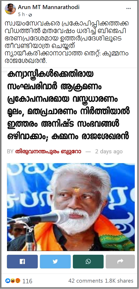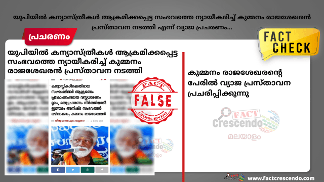 Title:യുപിയിൽ കന്യാസ്ത്രീകൾ ആക്രമിക്കപ്പെട്ട സംഭവത്തെ ന്യായീകരിച്ച് കുമ്മനം രാജശേഖരൻ പ്രസ്താവന നടത്തി എന്ന് വ്യാജ പ്രചരണം…