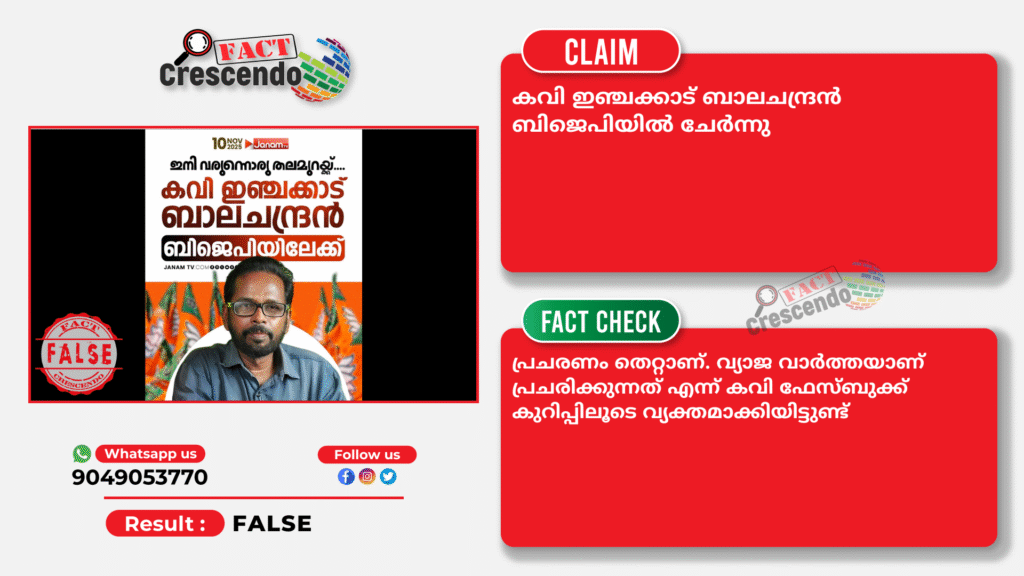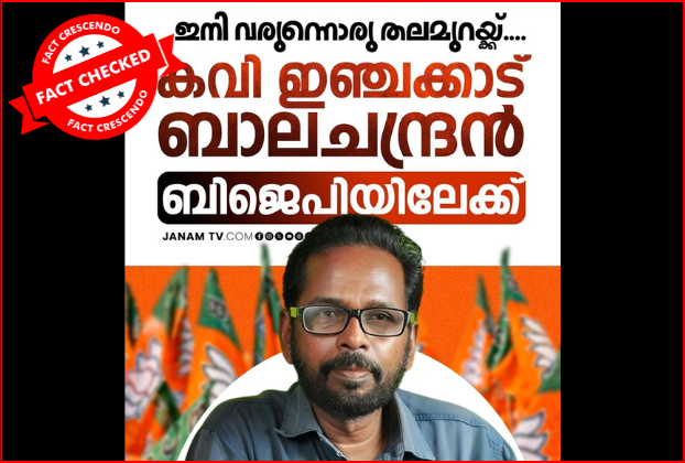 കവി ഇഞ്ചക്കാട് ബാലചന്ദ്രന് ബിജെപിയില് ചേര്ന്നുവെന്ന രീതിയില് പ്രചരിക്കുന്ന പോസ്റ്റുകള് തെറ്റിദ്ധരിപ്പിക്കുന്നതാണെന്ന് അന്വേഷണത്തില് വ്യക്തമായിട്ടുണ്ട്.