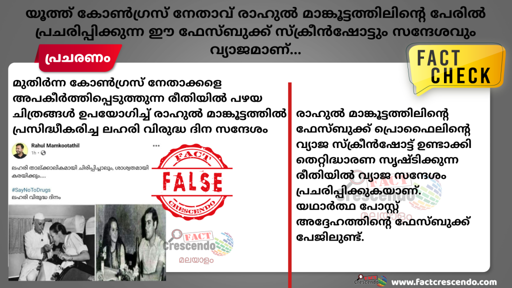 വിദ്യാര്ഥി പ്രസ്ഥാനത്തിലൂടെ ഉയര്ന്നു വന്ന് കോൺഗ്രസ് നേതാവായ രാഹുൽ മാങ്കൂട്ടത്തിൽ മുതിര്ന്ന കോൺഗ്രസ് നേതാക്കളുടെ പഴയ ചിത്രങ്ങൾ ഉപയോഗിച്ച് ലഹരിവിരുദ്ധ ദിനത്തിൽ സന്ദേശമായി പോസ്റ്റ് പ്രസിദ്ധീകരിച്ചു എന്ന മട്ടിലുള്ള പ്രചരണം വ്യാജ പ്രചരണം മാത്രമാണെന്ന് അന്വേഷണത്തിൽ കണ്ടെത്തിയിട്ടുണ്ട്.