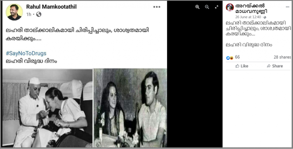 ഈ പോസ്റ്റ് രാഹുലിന്റെ ഫേസ്ബുക്ക് പേജില് ഇപ്പോഴും ലഭ്യമാണ്. ഇതിനെതിരെ സോണിയ-രാജീവ് ഗാന്ധിയുടെയും ജവഹർലാൽ നെഹ്റുവിന്റെയും ചിത്രങ്ങൾ ചേര്ത്ത് വ്യാജ സ്ക്രീന്ഷോട്ട് ഉണ്ടാക്കി പ്രചരിപ്പിക്കുകയാണ് ചെയ്യുന്നത്. കൂടുതൽ വ്യക്തതയ്ക്കായി ഞങ്ങള് രാഹുൽ മാങ്കൂട്ടത്തിലുമായി സംസാരിച്ചിരുന്നു: അദ്ദേഹം പറഞ്ഞത് ഇങ്ങനെയാണ്: “എനിക്കെതിരെയുള്ള വ്യാജ പ്രചരണം ശ്രദ്ധയിൽപ്പെട്ടിരുന്നു. ലഹരി വിരുദ്ധ ദിനത്തിൽ ഞാന് പ്രസിദ്ധീകരിച്ച പോസ്റ്റ് ഇതല്ല. ഞാന് ഇട്ട സന്ദേശം എന്റെ ഫേസ്ബുക്ക് പേജിൽ ഇപ്പോഴുമുണ്ട്. ഇതിനെതിരെ വ്യാജ സ്ക്രീൻഷോട്ട് ഉപയോഗിച്ച് വ്യാജ പ്രചരണം നടത്തുകയാണ്.”