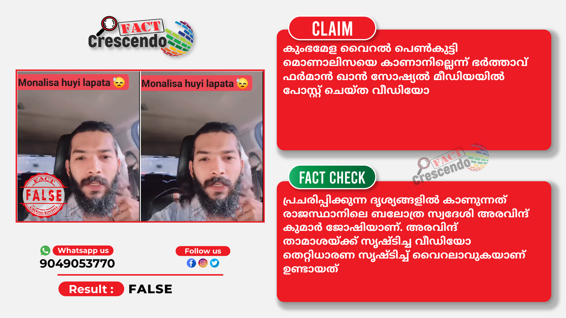 കുംഭമേള വൈറല് പെണ്കുട്ടി മൊണാലിസയെ കാണാനില്ലെന്ന് ഭര്ത്താവ് ഫര്മാന് ഖാന് സോഷ്യല് മീഡിയയില് പോസ്റ്റ് ചെയ്ത വീഡിയോ എന്ന് പ്രചരിപ്പിക്കുന്ന ദൃശ്യങ്ങളില് കാണുന്നത് രാജസ്ഥാനിലെ ബലോത്ര സ്വദേശി അരവിന്ദ് കുമാർ ജോഷിയാണ്. അരവിന്ദ് താമാശയ്ക്ക് സൃഷ്ടിച്ച വീഡിയോ തെറ്റിധാരണ സൃഷ്ടിച്ച് വൈറലാവുകയാണ് ഉണ്ടായത്.