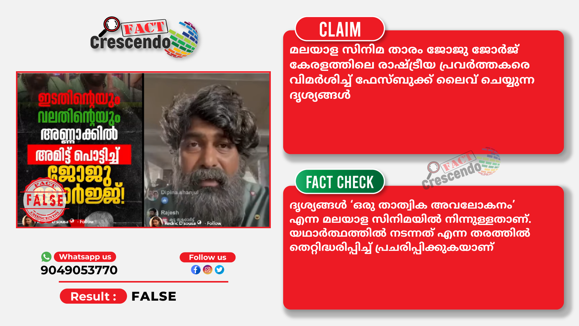 മലയാള സിനിമ താരം ജോജു ജോര്ജ് കേരളത്തിലെ രാഷ്ട്രീയ പ്രവര്ത്തകരെ വിമര്ശിച്ച് ഫേസ്ബുക്ക് ലൈവ് ചെയ്യുന്നു എന്ന് പ്രചരിപ്പിക്കുന്ന ദൃശ്യങ്ങള് ‘ഒരു താത്വിക അവലോകനം’ എന്ന സിനിമയില് നിന്നുള്ളതാണ്. യഥാര്ത്ഥത്തില് നടന്നത് എന്ന തരത്തില് തെറ്റിദ്ധരിപ്പിച്ച് പ്രചരിപ്പിക്കുകയാണ്.