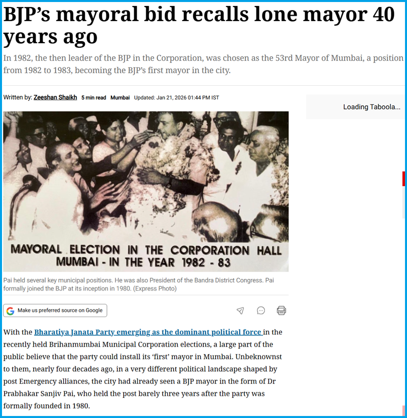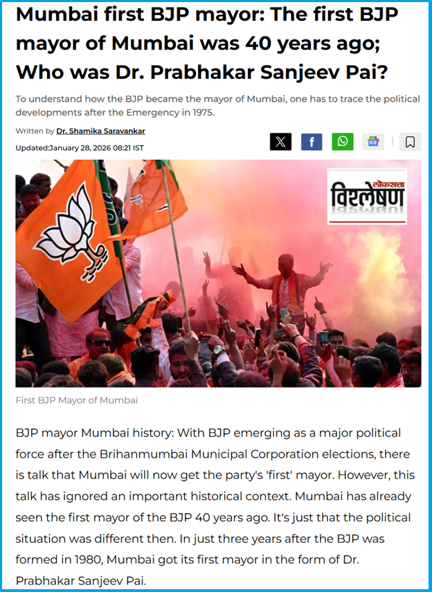 ബിഎംസിയുടെ ആദ്യ ബിജെപി മേയര് ആരാണെന്ന് തിരഞ്ഞപ്പോള് ഞങ്ങള്ക്ക് പല റിപ്പോര്ട്ടുകളും ലഭ്യമായി. മഹാരാഷ്ട്രയിലെ തദ്ദേശ തിരഞ്ഞെടുപ്പ് ഫലം വന്നതിനു തൊട്ടുപിന്നാലെ 2026 ജനുവരി 26ന് Loksatta നല്കിയ റിപ്പോര്ട്ട് പ്രകാരം ഡോ.പ്രഭാകര് സഞ്ജീവ് പൈ ആണ് ബിജെപിയുടെ ആദ്യ മുംബൈ മേയര്.