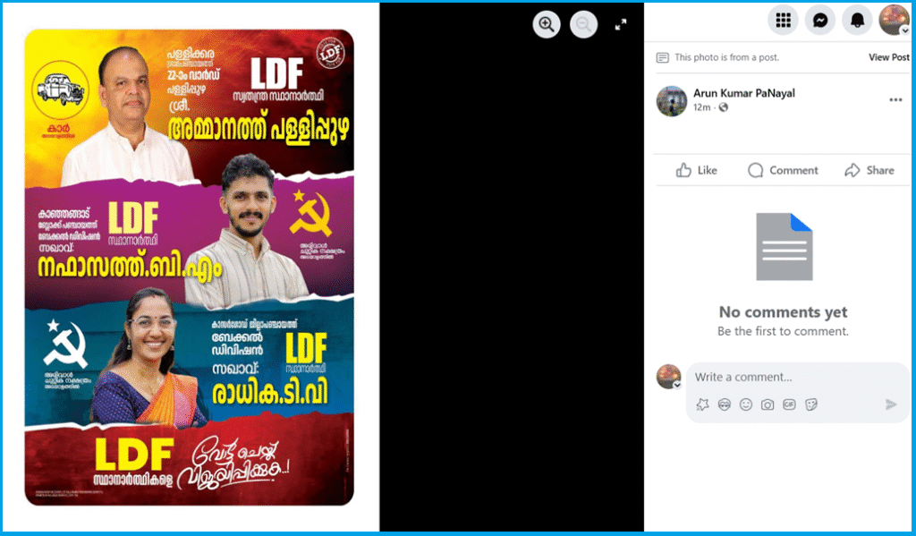 കേരളത്തിലെ തദ്ദേശ തിരഞ്ഞെടുപ്പിന് ഇനി ദിവസങ്ങള് മാത്രമേയുള്ളൂ ബാക്കി. ഇത്തവണ 17337 ഗ്രാമ പഞ്ചായത്തുകളിലാണ് തെരഞ്ഞെടുപ്പ് നടക്കുക. എണ്ണം വര്ദ്ധിപ്പിച്ചതിനാല് 23,576 വാര്ഡുകളില് പ്രമുഖ പാര്ട്ടികളുടെ സ്ഥാനാര്ഥികള് ജനവിധി തേടും. തിരഞ്ഞെടുപ്പ് പ്രചാരണം എല്ലായിടവും സജീവമാണ്. ഈ പശ്ചാത്തലത്തില് എല്ഡിഎഫ് ഇതര സംസ്ഥാന തൊഴിലാളിയെ സ്ഥാനാര്ഥിയാക്കി രംഗത്തിറക്കി എന്നവകാശപ്പെട്ട് ഒരു പോസ്റ്റര് പ്രചരിക്കുന്നുണ്ട്.