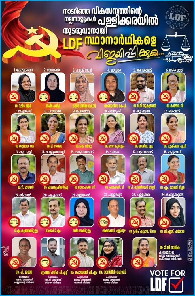 പള്ളിക്കര ഗ്രാമ പഞ്ചായത്തിലെ ഇടതുപക്ഷ സ്ഥാനാര്ഥികകളുടെ മുഴുവന് പട്ടികയും സാമൂഹ്യ മാധ്യമങ്ങളില് തദ്ദേശീയ പലരും പങ്കുവച്ചിട്ടുണ്ട്.