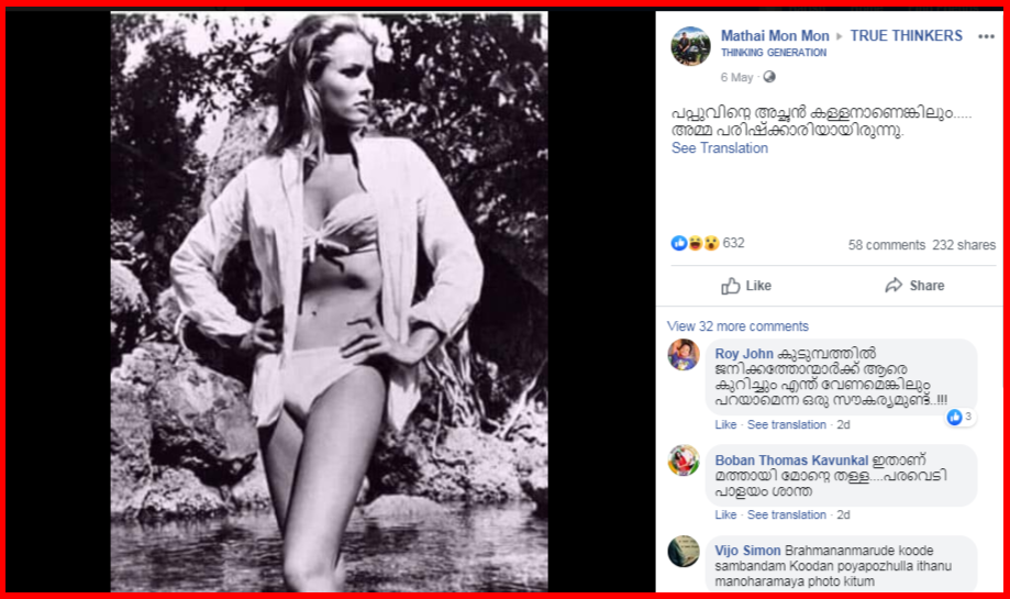 ഈ ചിത്രം വ്യാജ അടികുറിപ്പ് ചേർത്ത് പ്രചരിപ്പിക്കുകയാണ്. ചിത്രത്തിൽ കാണുന്നത് സോണിയ ഗാന്ധി അല്ല ജെയിംസ് ബോണ്ട് പടത്തിലെ നയികയായ ഉർസുല അന്ദ്രെസ്സ് ആണ്. സോണിയ ഗാന്ധിയുടെ പേരിൽ പ്രചരിപ്പിക്കുന ഈ പോസ്റ്റ് തെറ്റാണ്. അതിനാൽ പ്രിയ വായനക്കാർ ദയവായി ഈ ചിത്രം ഷെയർ ചെയ്യരുതെന്ന് ഞങ്ങൾ അഭ്യർത്ഥിക്കുന്നു.