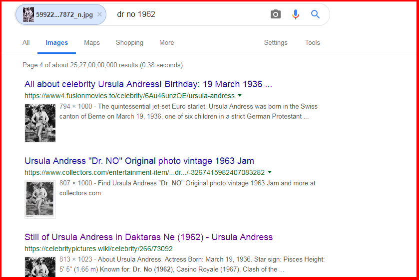 ഈ ചിത്രം സോണിയ ഗന്ധിയുടെതല്ല പകരം ഒരു സ്വിസ് അഭിനേത്രിയായ ഉർസുല അന്ദ്രേസ്സിന്റെതാണ്. 1962ൽ റിലീസായ ബോണ്ട് പടം ആയിരുന്നു Dr. No. ജെയിംസ് ബോണ്ടിന്റെ പടങ്ങളുടെ പാരമ്പരയിലെത്തന്നെ ആദ്യത്തെ പടം ആയിരുന്നു അത്. ഈ ചിത്രത്തിൽ ജെയിംസ് ബോണ്ട് ആയി അഭിനയിച്ചഷോൺ കൊനരിയുടെ നായിക ഉർസുല അന്ദ്രെസ്സ് ആയിരുന്നു. ഈ ചിത്രത്തിലെ ഒരു സീനിന്റെ ഷോട്ട് ആണ് ഇത്. ഈ ചിത്രം IMDB വെബ്സൈറ്റിൽ ഉണ്ട്. അത് പോലെ Alamy വെബ്സൈറ്റിലും ഈ ചിത്രം ഉണ്ട്.