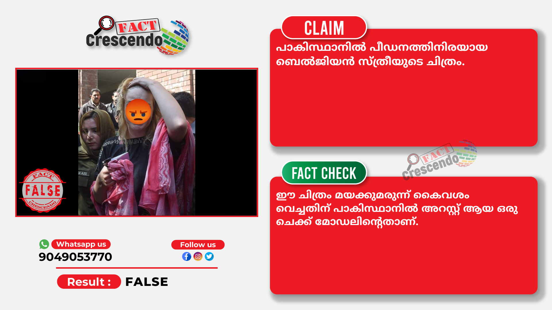 മയക്കുമരുന്ന് കേസിൽ പാകിസ്ഥാനിൽ അറസ്റ്റ് ആയ ഒരു ചെക്ക് മോഡലുടെ ചിത്രം തെറ്റായ വിവരണത്തോടെ സമൂഹ മാധ്യമങ്ങളിൽ പ്രചരിപ്പിക്കുന്നതാണെന്ന് അന്വേഷണത്തിൽ നിന്ന് വ്യക്തമാകുന്നു. ഹെറോയിൻ കൈവശം വെച്ചത്തിൻ്റെ ആരോപണം നേരിട്ട ഒരു ചെക്ക് വനിതയുടെ ചിത്രമാണ് തെറ്റായ വിവരണത്തോടെ സമൂഹ മാധ്യമങ്ങളിൽ പ്രചരിപ്പിക്കുന്നത്.