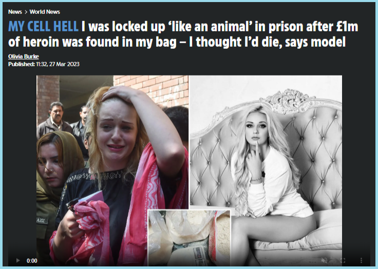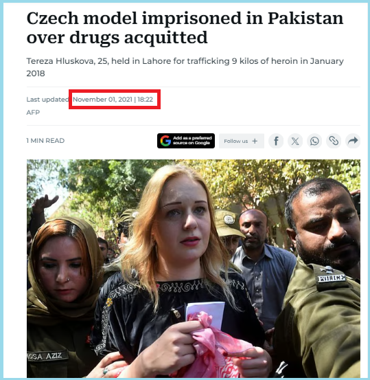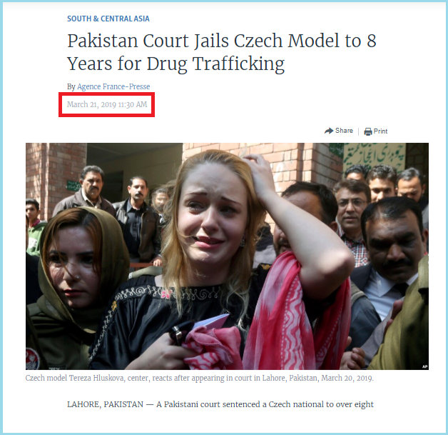വാർത്ത പ്രകാരം ചിത്രത്തിൽ കാണുന്നത് തെരേസ ലുസ്കോവ എന്ന ചെക്ക് മോഡലാണ്. ജനുവരി 2018ൽ പാകിസ്ഥാനിൽ നിന്ന് ദുബായ് വഴി അയർലണ്ട് പോകുന്നത്തിനിടെ പാക്കിസ്ഥാൻ സുരക്ഷാ ഉദ്യോഗസ്ഥർ ഇവരെ അറസ്റ്റ് ചെയ്തു. ലാഹോർ പോലീസ് പ്രകാരം ഇവരുടെ പക്കത്തിൽ നിന്ന് 8.5 കിലോ ഹെറോയിൻ പിടികൂടിയിരുന്നു. മാർച്ച് 2019ൽ പാകിസ്താനിലെ ഒരു കോടതി ഇവരെ 8 കൊല്ലം തടവ് പ്രഖ്യാപിച്ചു. ഈ ശിക്ഷ പ്രഖ്യാപിച്ചതിനെ തുടർന്ന് കോടതിയിൽ നിന്ന് പുറത്തു വരുമ്പോൾ എടുത്ത ചിത്രമാണിത്.