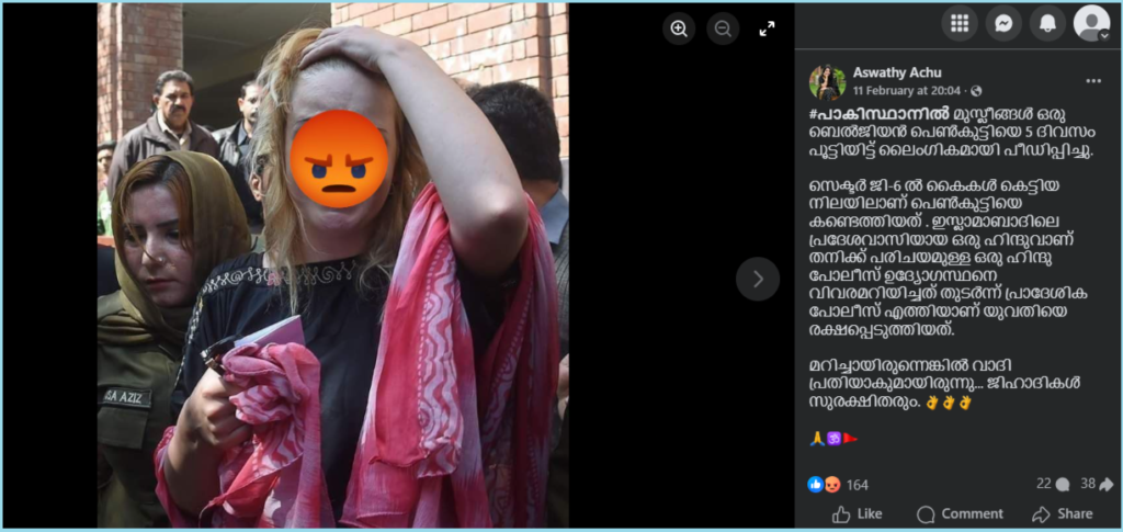 മുകളിൽ നൽകിയ പോസ്റ്റിൽ നമുക്ക് ഒരു ചിത്രം കാണാം. ഈ ചിത്രത്തിനെ കുറിച്ച് പോസ്റ്റിൻ്റെ അടുക്കിക്കുറിപ്പിൽ പറയുന്നത് ഇങ്ങനെയാണ് : “#പാകിസ്ഥാനിൽ മുസ്ലീങ്ങൾ ഒരു ബെൽജിയൻ പെൺകുട്ടിയെ 5 ദിവസം പൂട്ടിയിട്ട് ലൈംഗികമായി പീഡിപ്പിച്ചു. സെക്ടർ ജി-6 ൽ കൈകൾ കെട്ടിയ നിലയിലാണ് പെൺകുട്ടിയെ കണ്ടെത്തിയത് . ഇസ്ലാമാബാദിലെ പ്രദേശവാസിയായ ഒരു ഹിന്ദുവാണ് തനിക്ക് പരിചയമുള്ള ഒരു ഹിന്ദു പോലീസ് ഉദ്യോഗസ്ഥനെ വിവരമറിയിച്ചത് തുടർന്ന് പ്രാദേശിക പോലീസ് എത്തിയാണ് യുവതിയെ രക്ഷപ്പെടുത്തിയത്. മറിച്ചായിരുന്നെങ്കിൽ വാദി പ്രതിയാകുമായിരുന്നു… ജിഹാദികൾ സുരക്ഷിതരും. 👌👌👌 🙏🕉️🚩”