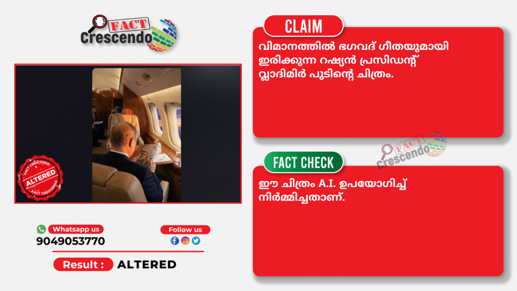 വിമാനത്തിൽ ഭഗവദ് ഗീതയുമായി ഇരിക്കുന്ന റഷ്യൻ പ്രസിഡൻ്റ വ്ലാദിമിർ പുടിൻ്റെ ചിത്രം എന്ന തരത്തിൽ പ്രചരിപ്പിക്കുന്ന ചിത്രം AI നിർമ്മിതമാണെന്ന് അന്വേഷണത്തിൽ നിന്ന് വ്യക്തമാകുന്നു.